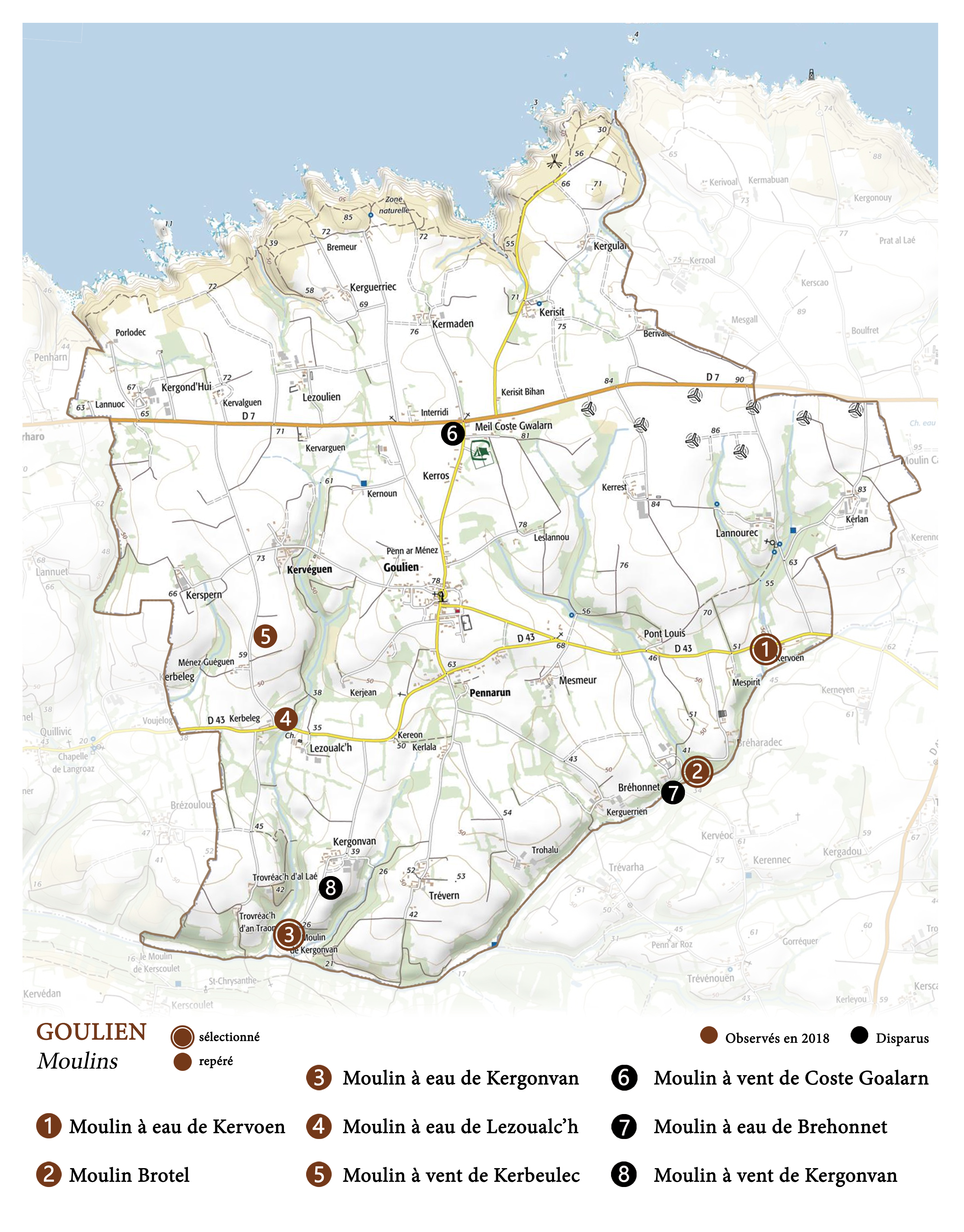 Les moulins sur la commune de Goulien,