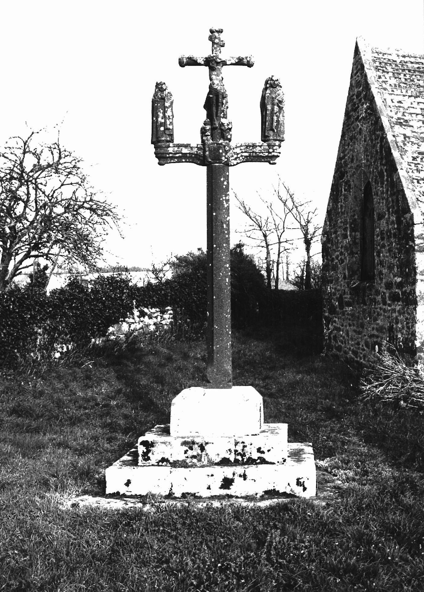 Calvaire de la chapelle de Langroas daté 1778, vue prise de l'ouest avec la chapelle en arrière plan. (1977)Immatriculation