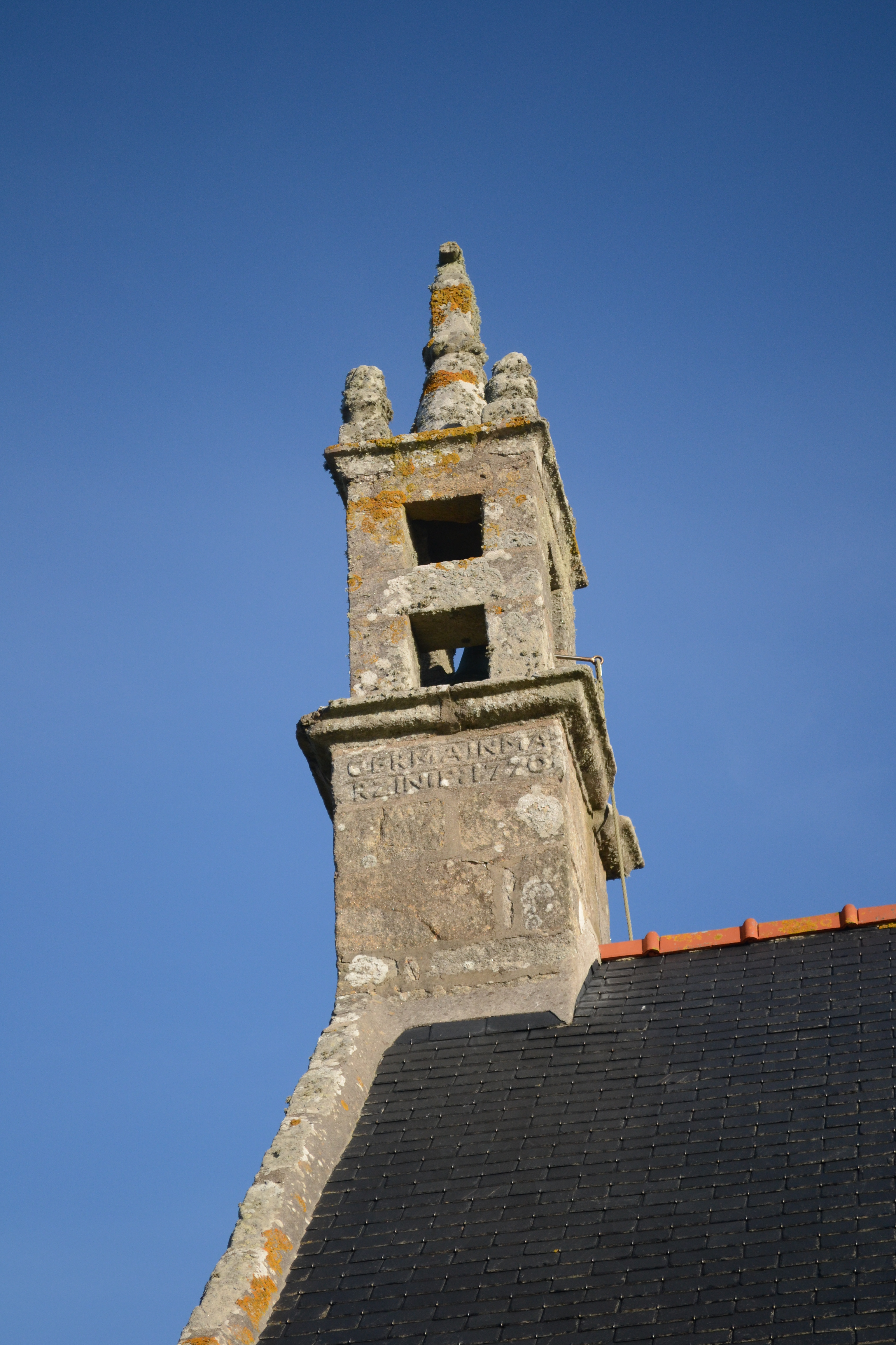 Clocher, vue rapprochée du côté sud. Inscription GERMAIN MARZIN : F : 1770. (2019)Immatriculation