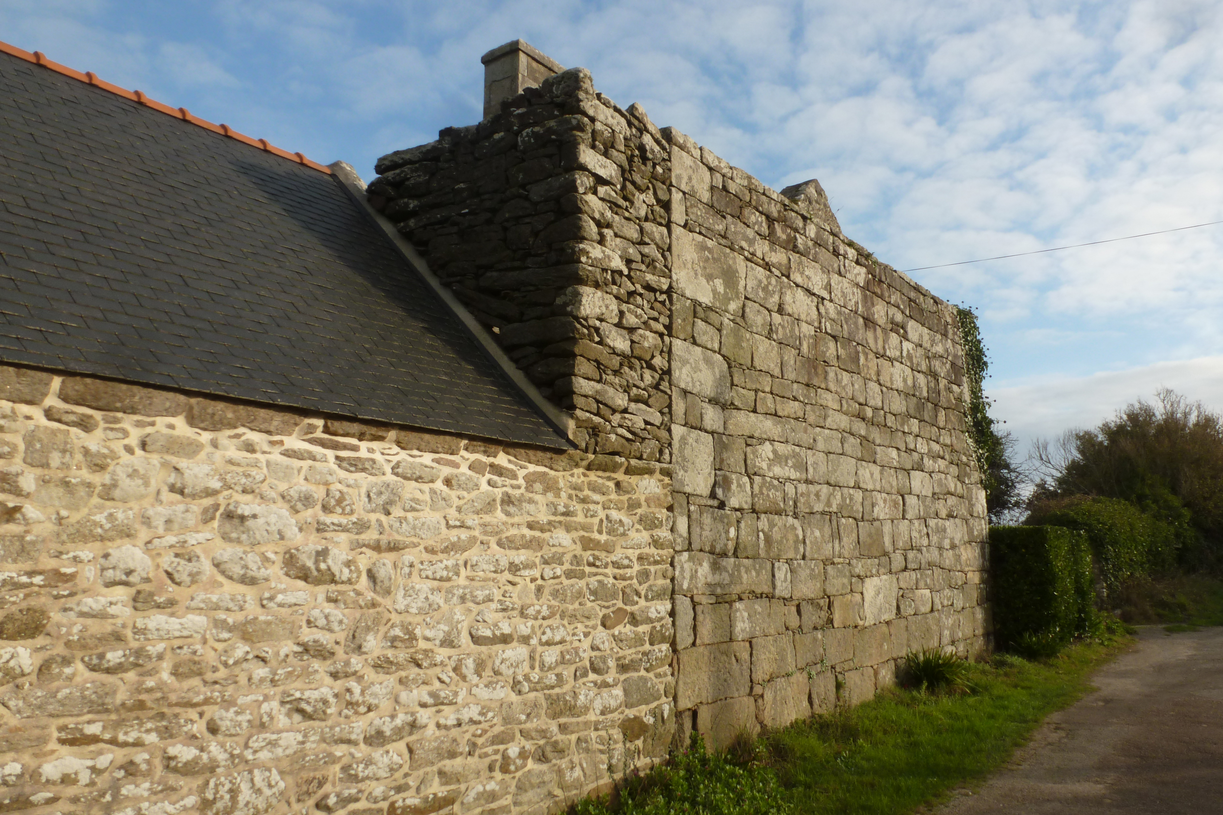 Entrée ouest du village, mur d'enclos en pierres de taille. (2019)Immatriculation