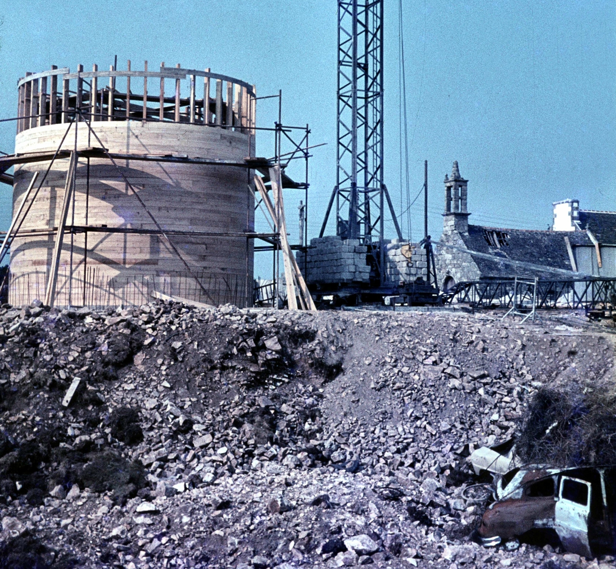 Château d'eau en construction et chapelle dégradée en second plan. (1966)Immatriculation