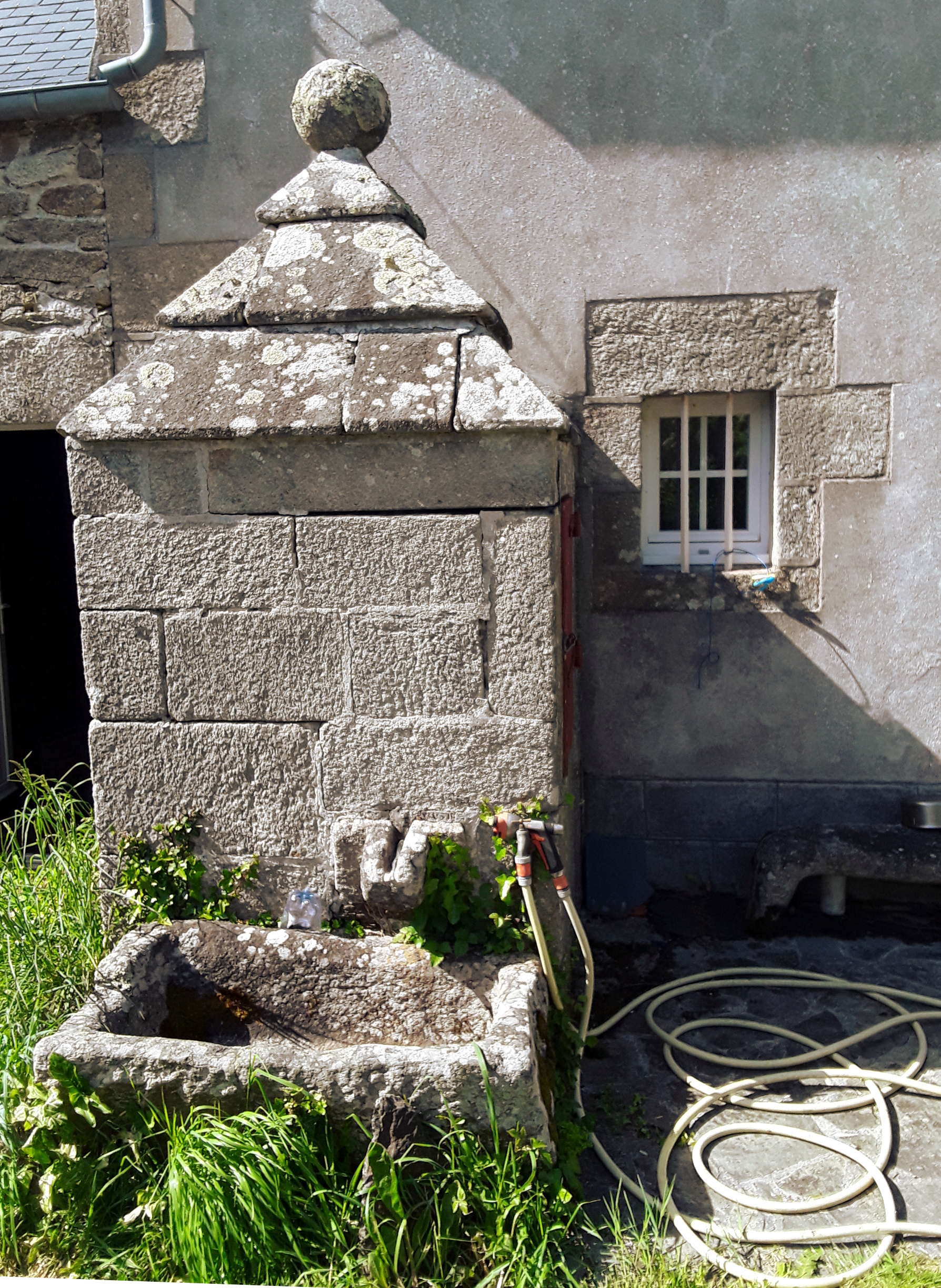 Pennarun d'Antraon, ferme1, puits et pierre d'écoulement de l'eau vers l'auge. Côté sud.Immatriculation