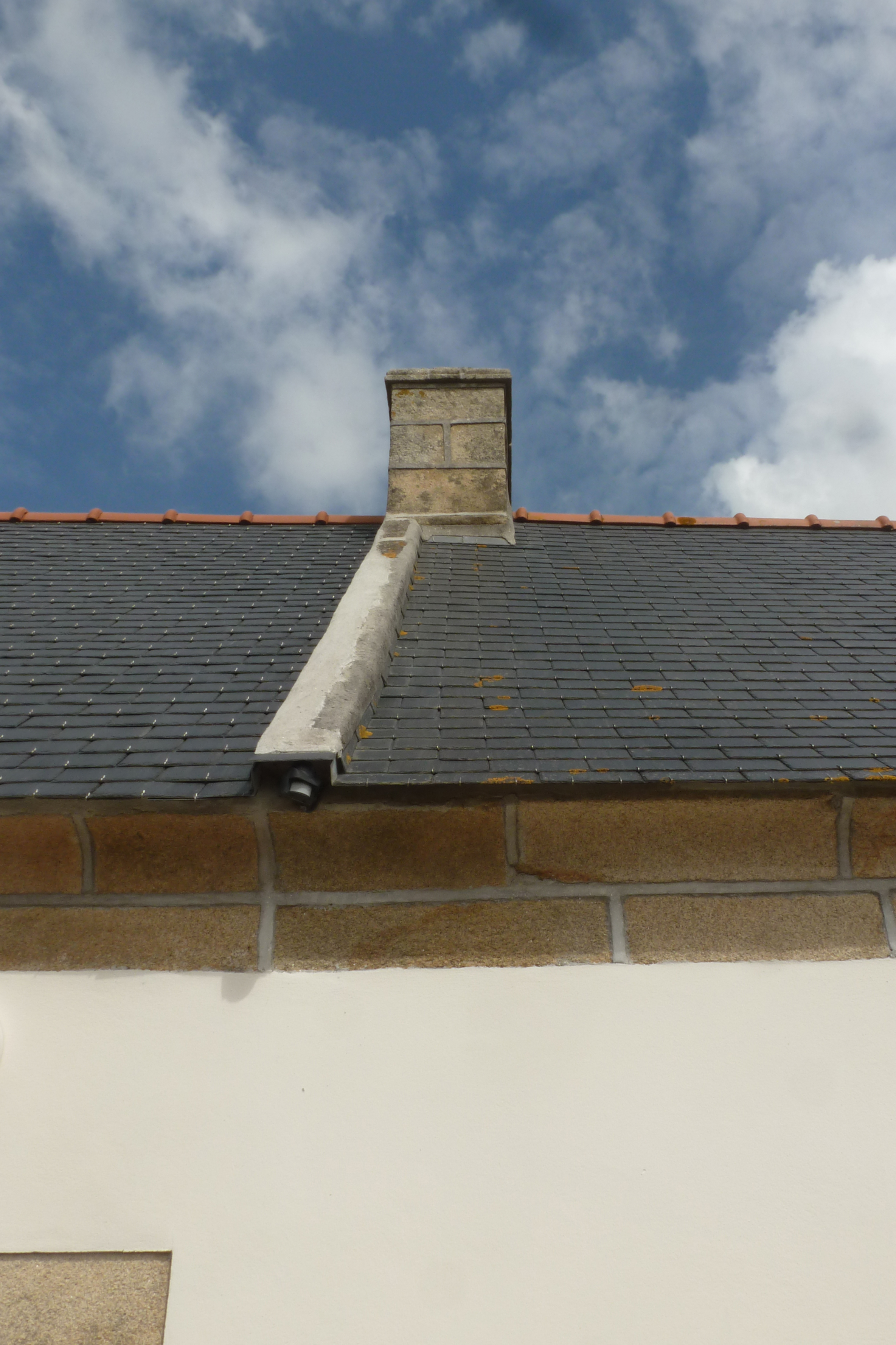 Logis, détail de la corniche du toit et de la souche de cheminée ouest. (2019)Immatriculation