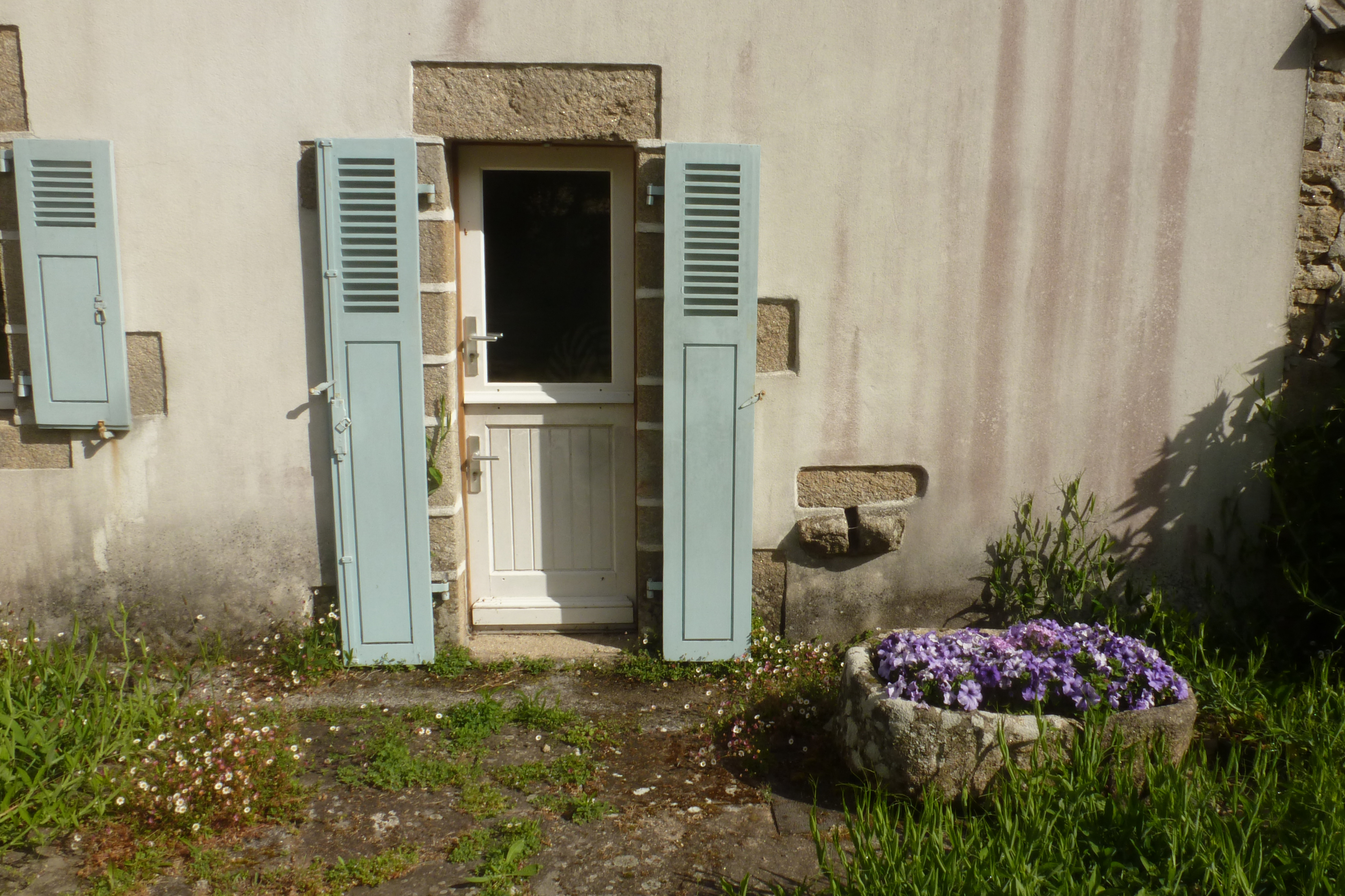 Logis, côté est. Jour transformé en porte, pierre d'écoulement et auge monolithe.Immatriculation