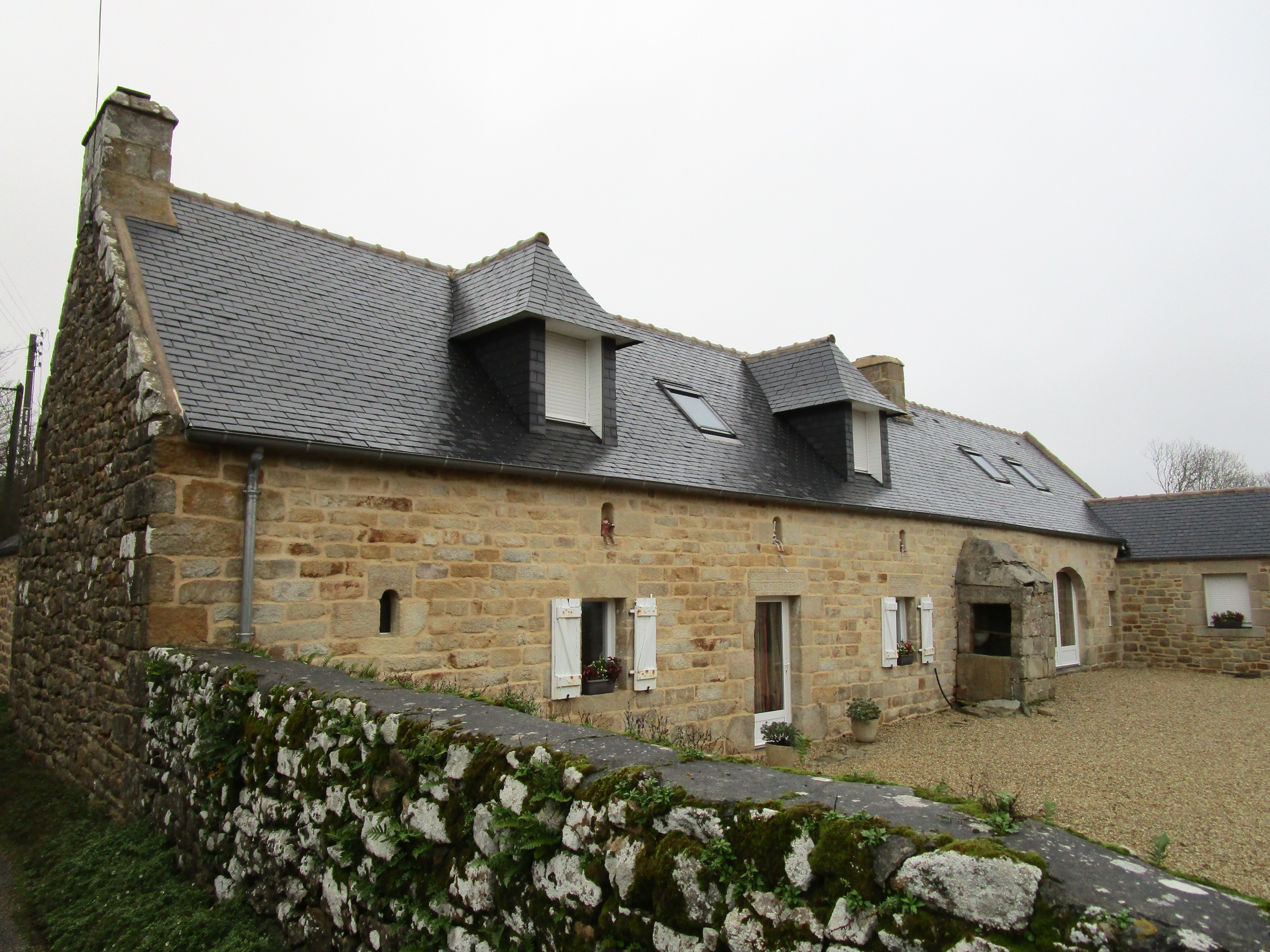 Kerlazen, ferme 4, logis daté 1829, puits accolé à la façade antérieure et grange à porte charretière dans l'alignement. Combles à surcroit éclairé par trois jours en plein cintre.Immatriculation