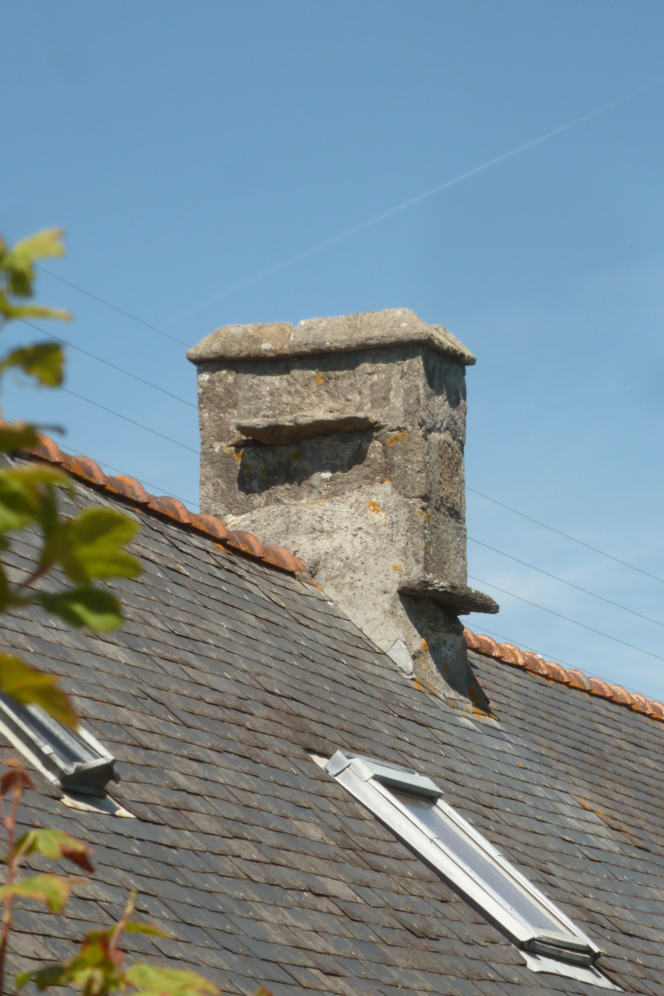 Ferme 5, détail de la souche de cheminée du logis et larmiers saillants, côté sud.Immatriculation