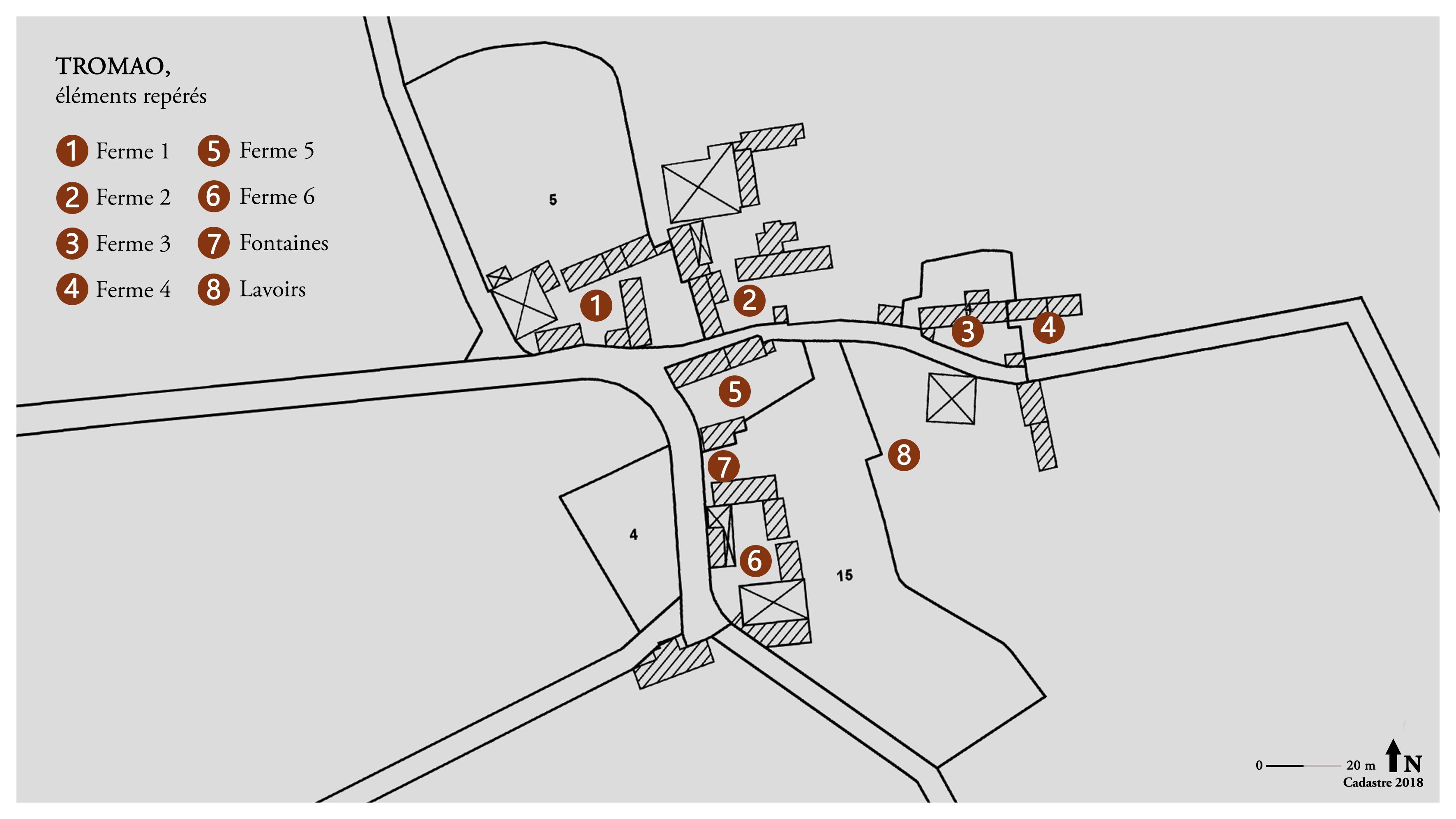 Village de Tromao, éléments repérés. Fond : cadastre 2018.Immatriculation