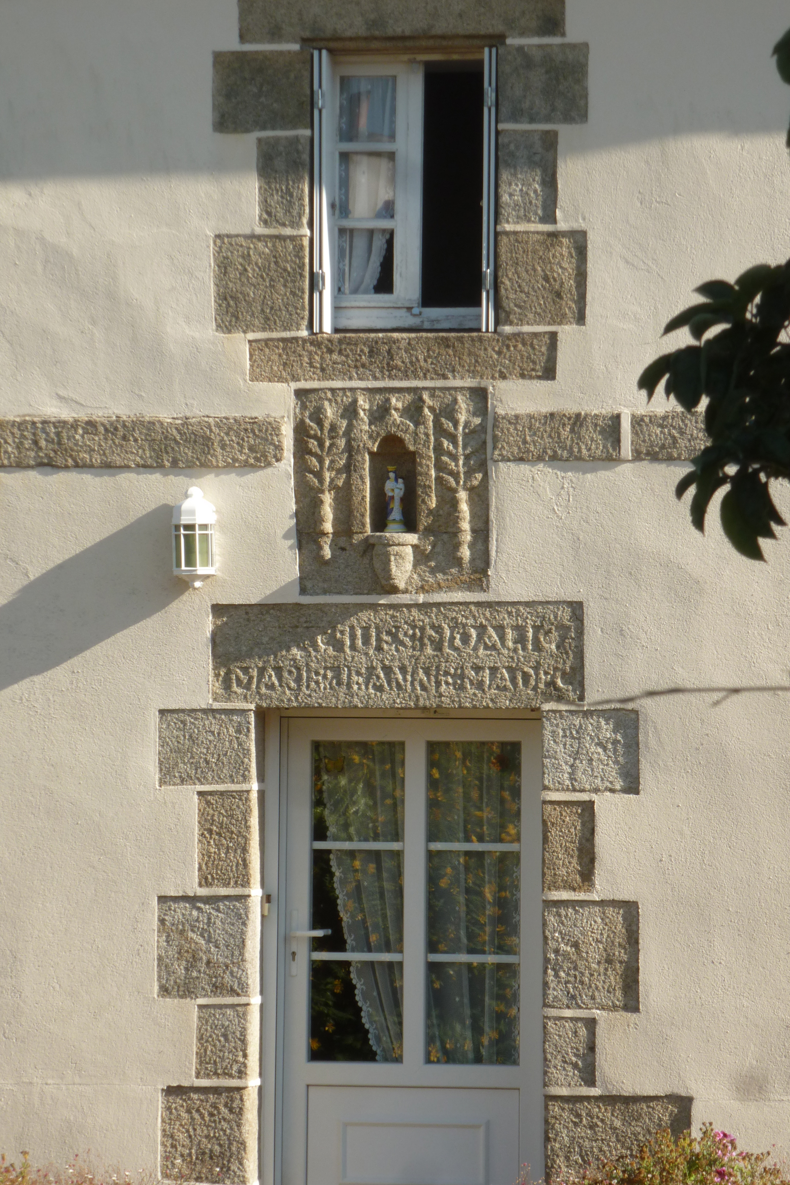 Trevenouen, ferme, détail de la niche à saint au-dessus de la porte d'entrée et inscription JACQUES : MOALIC / MARIE : JEANNE : MADEC. (2019)Immatriculation