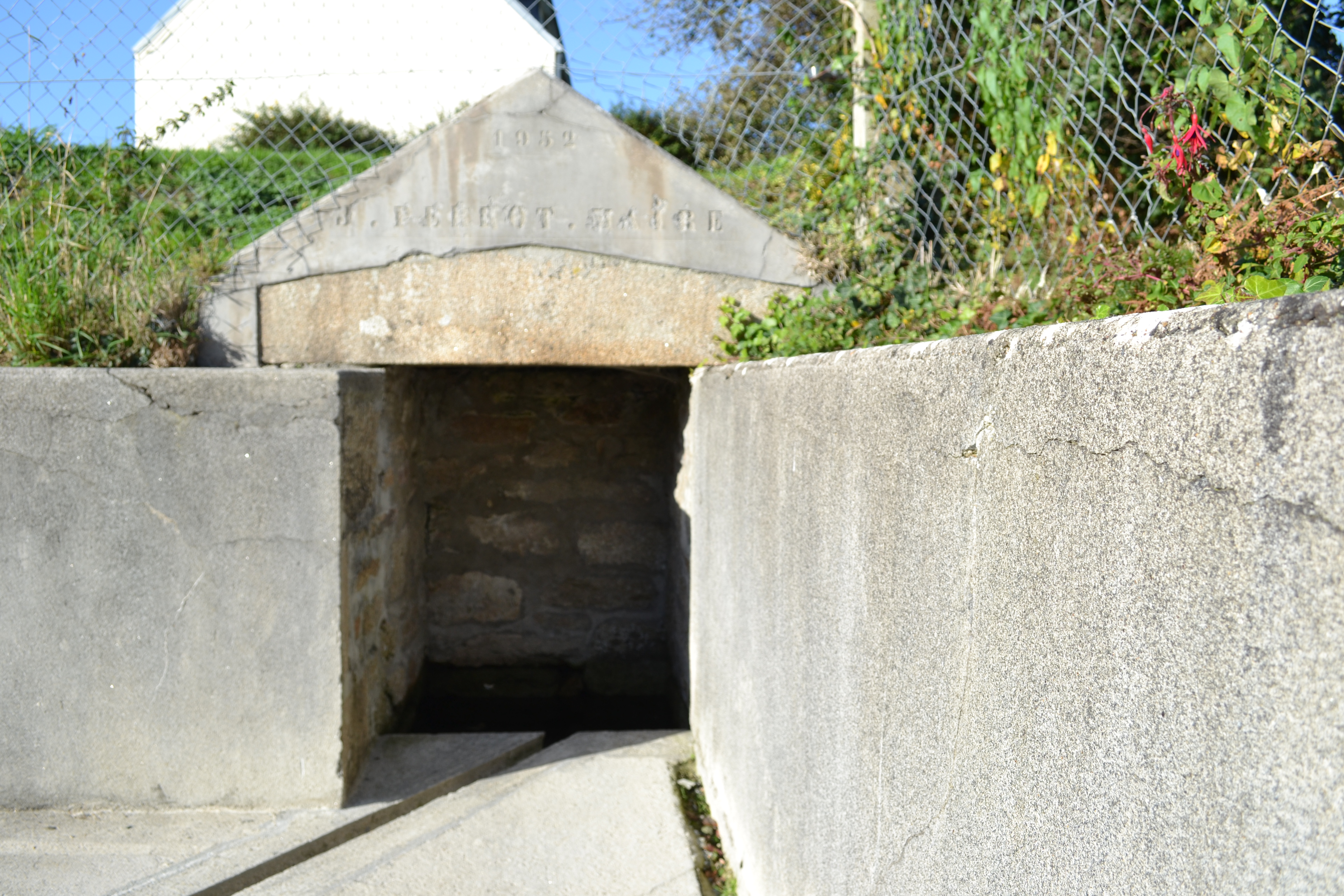 Fontaine dite "de parc alec" et inscriptions : 1952, J. PERROT, MAIRE. vue prise du sud.Immatriculation