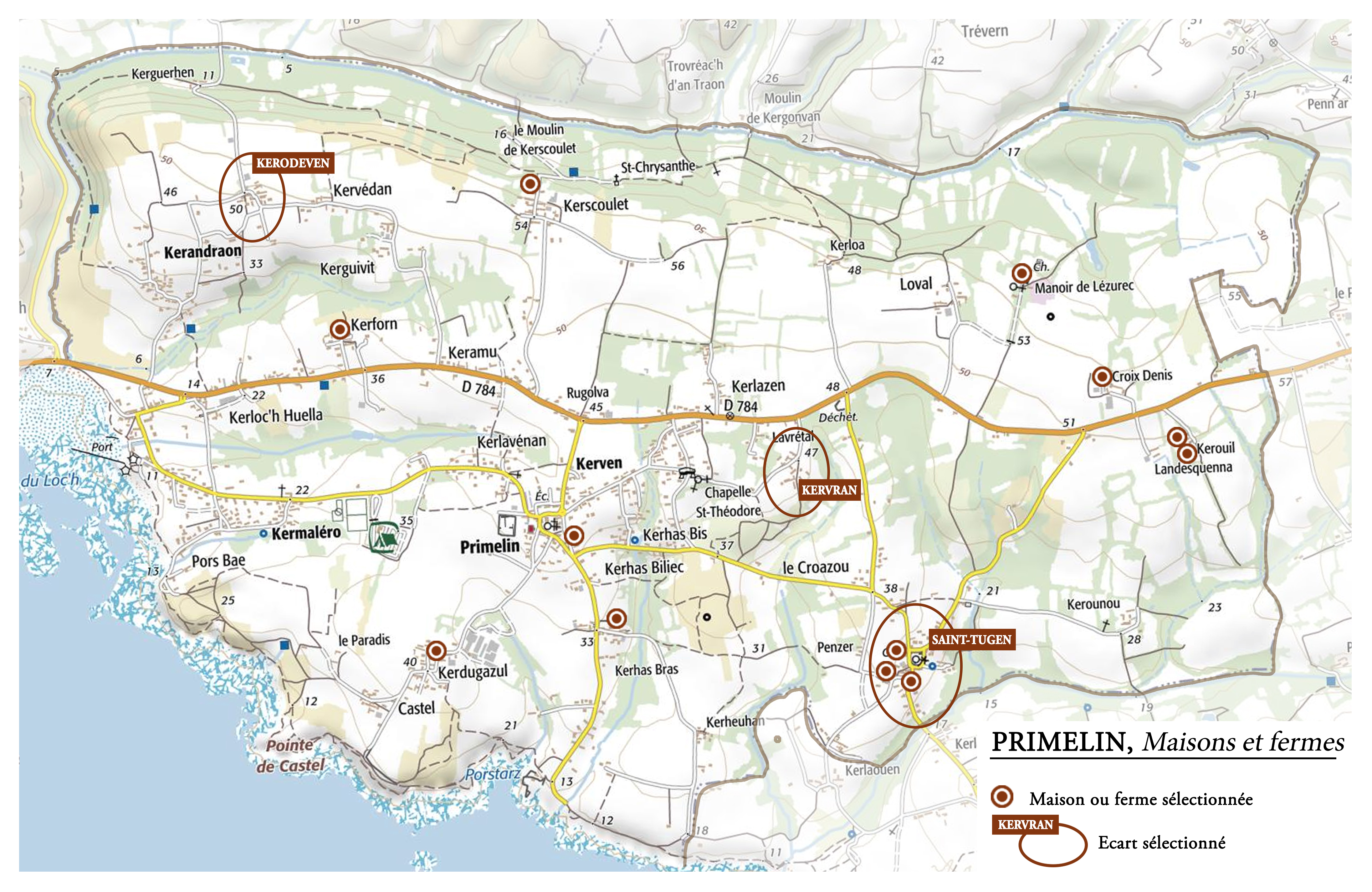 Les maisons et fermes de Primelin, carte de localisation des éléments sélectionnés.Immatriculation
