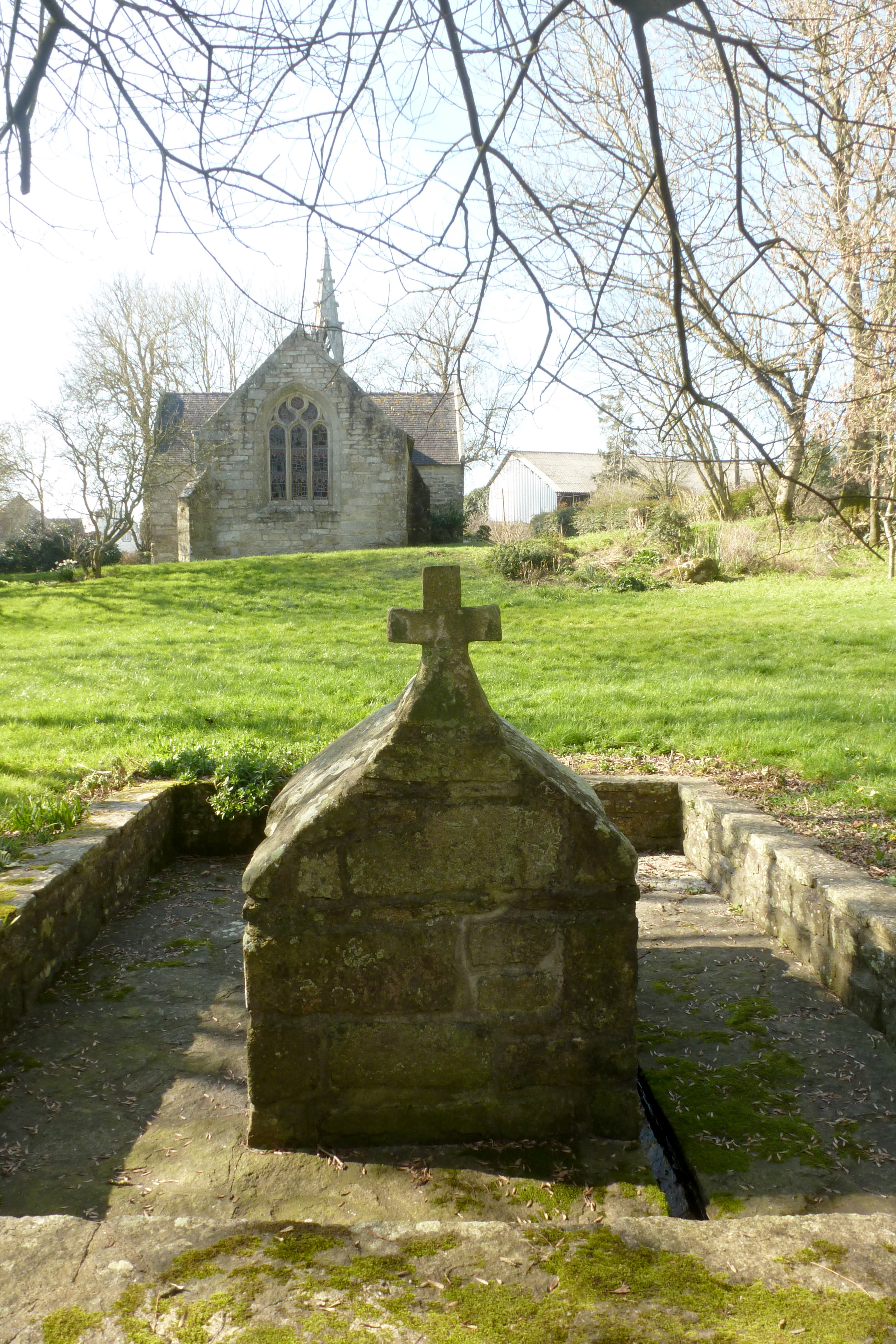 Vue générale de la fontaine dans son enclos prise de l'est avec la chapelle Saint-Conogan en arrière plan. (2019)Immatriculation