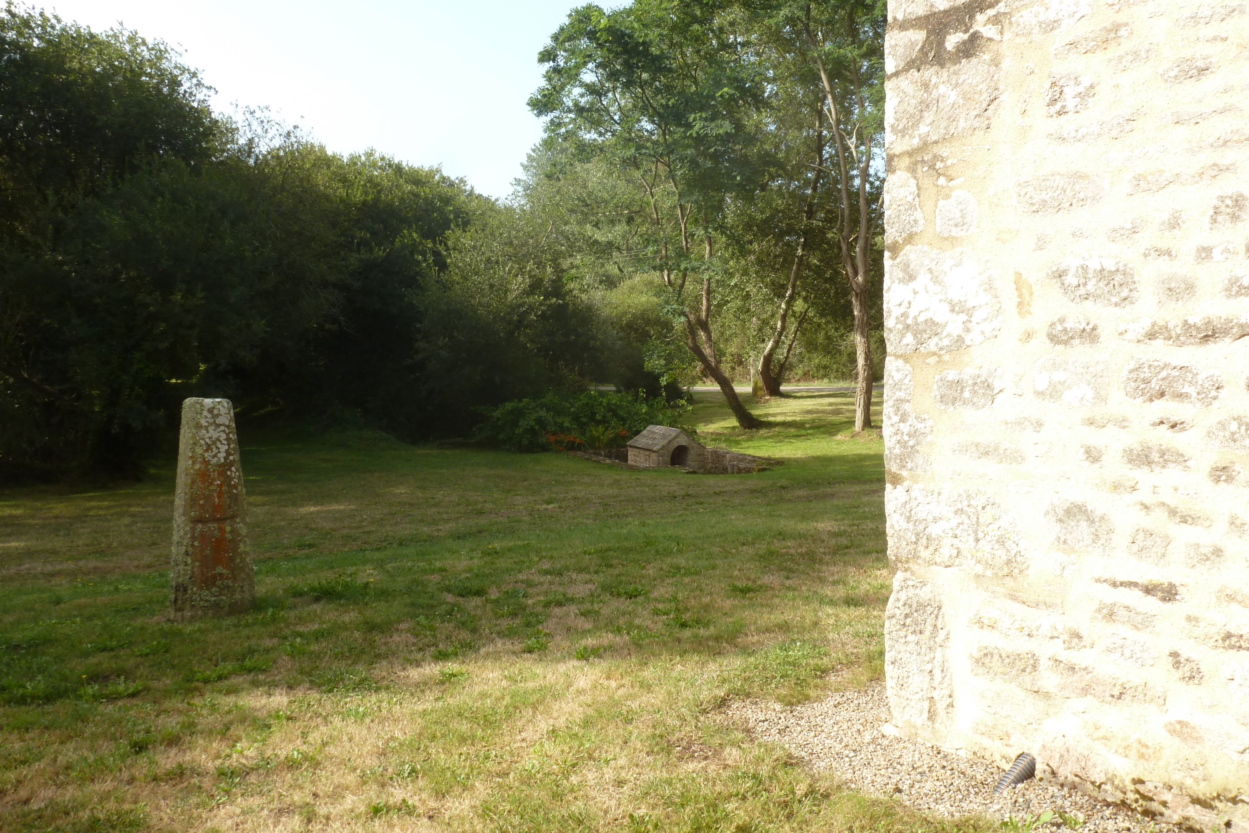 Stèle christianisée et fontaine, vue prise du nord, au niveau du chevet de la chapelle. (2019)Immatriculation