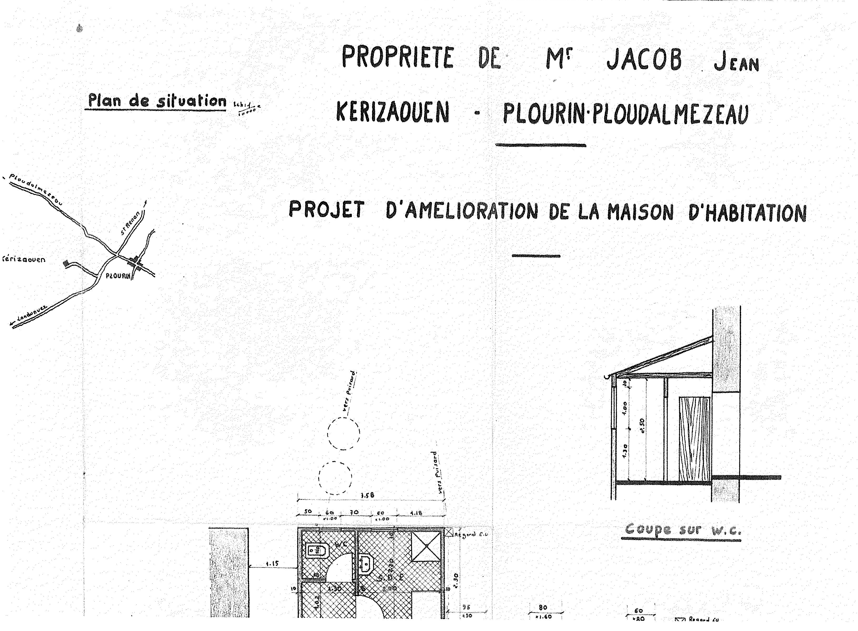 Projet d'amélioration de la maison d'habitation de Jean Jacob, coupe de la salle d'eau située en appentis au nord, état projeté, vers 1960-1975 (collection particulière)Immatriculation