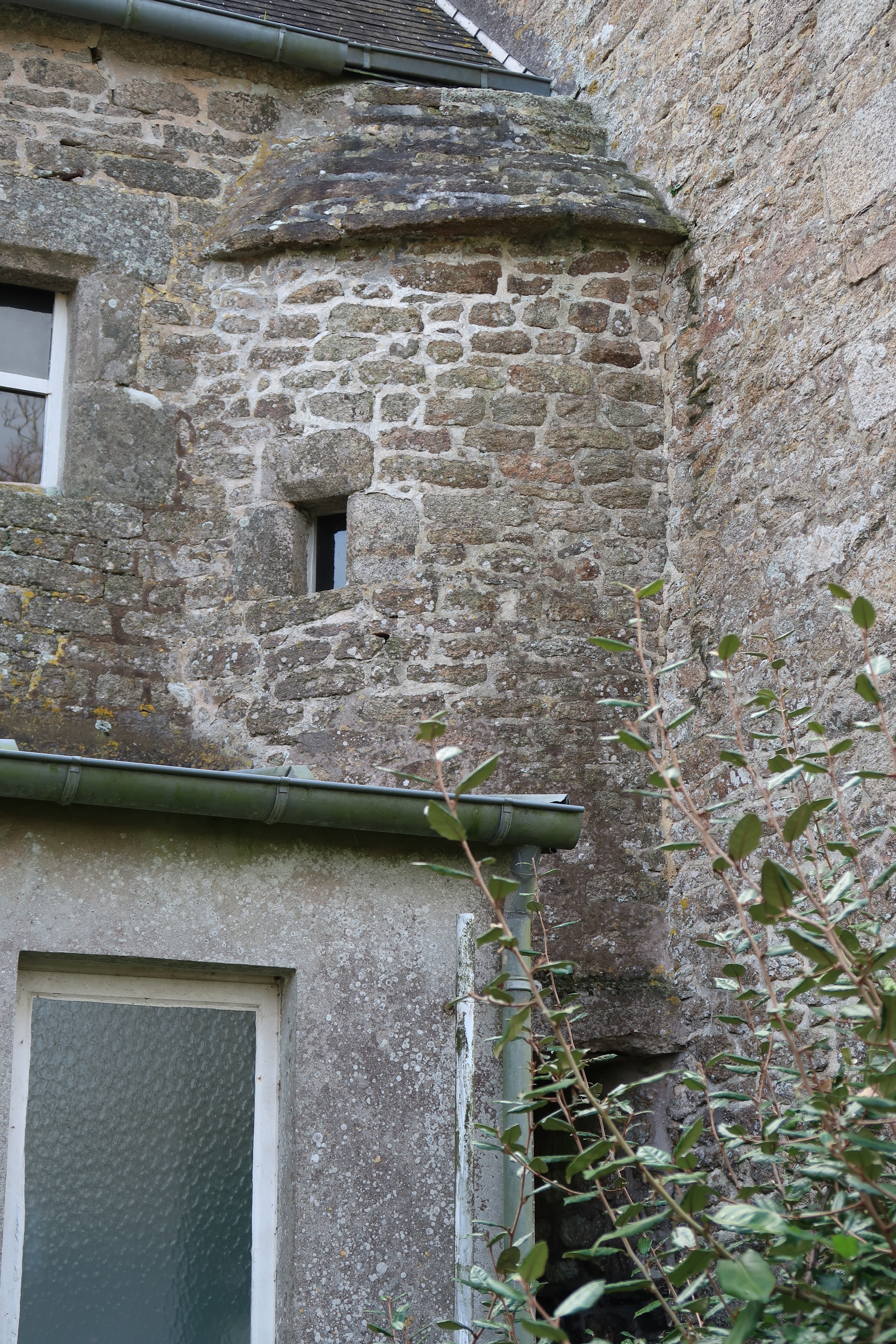 Elévation postérieure orientée vers le nord-nord-est : détail de la tour d'escalier en demi hors œuvre. Au premier plan, salle d'eau construite en parpaingImmatriculation