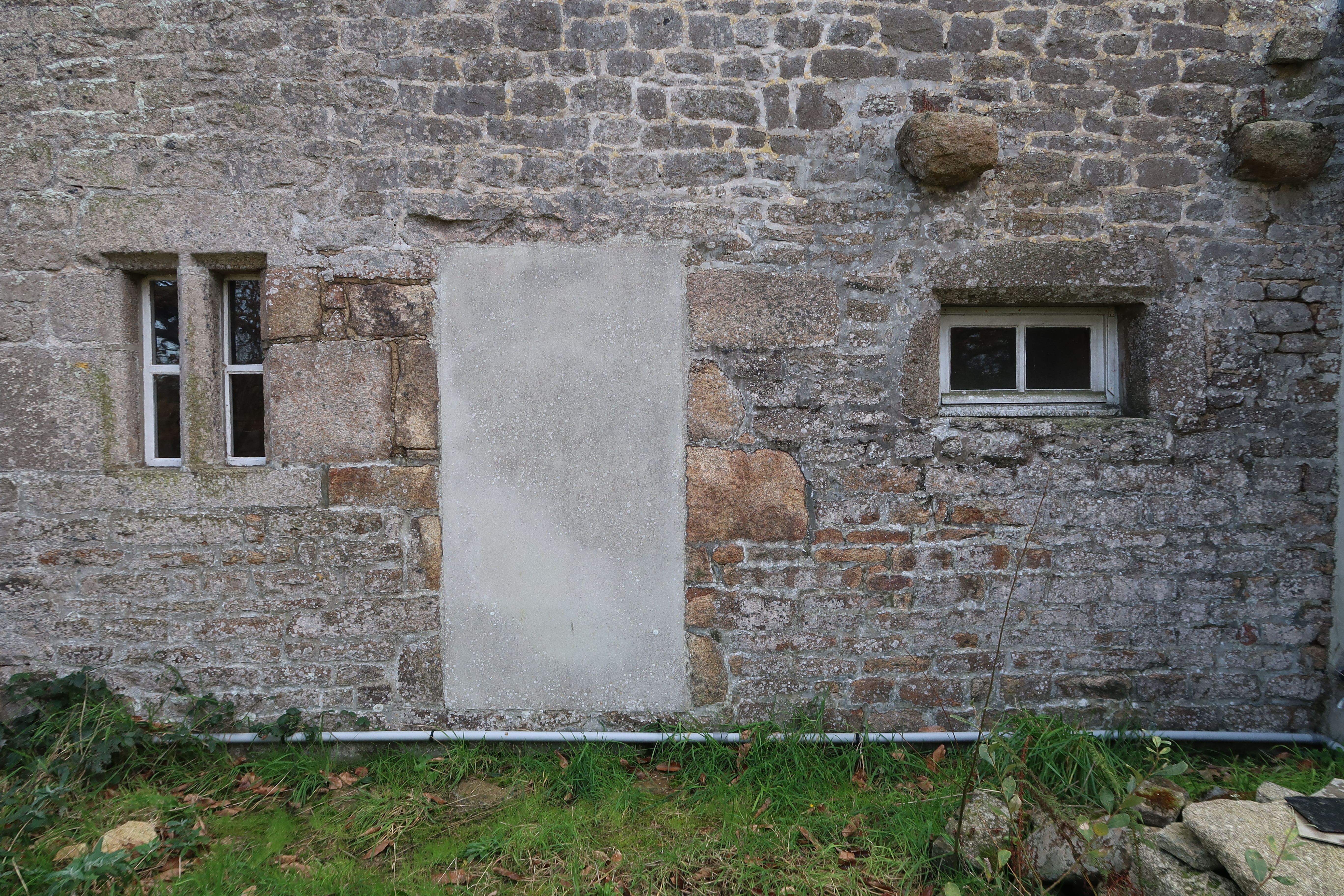 Elévation postérieure orientée vers le nord-nord-est : détail des ouvertures (fenêtres ; porte et corbeaux suggérant la présence ancienne d'un bâtiment en appentis), état en 2019Immatriculation