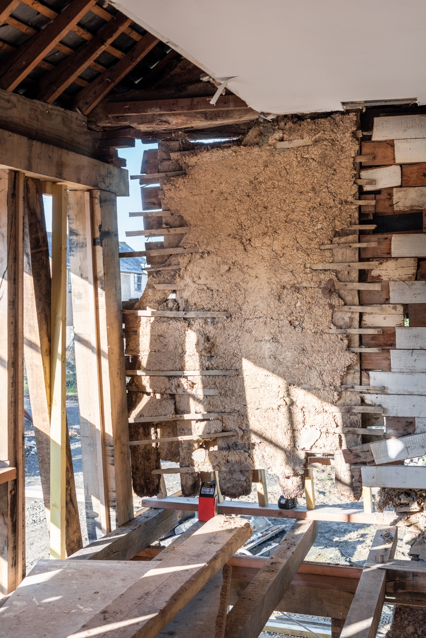 Structure du pan de bois de la façade nord : colombes obliques avec remplissage en torchis et traces anciennes de lattisImmatriculation