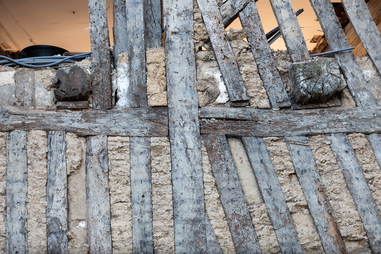 Façade nord : colombes verticales et obliques avec remplissage en torchis ; sorties de poutresImmatriculation