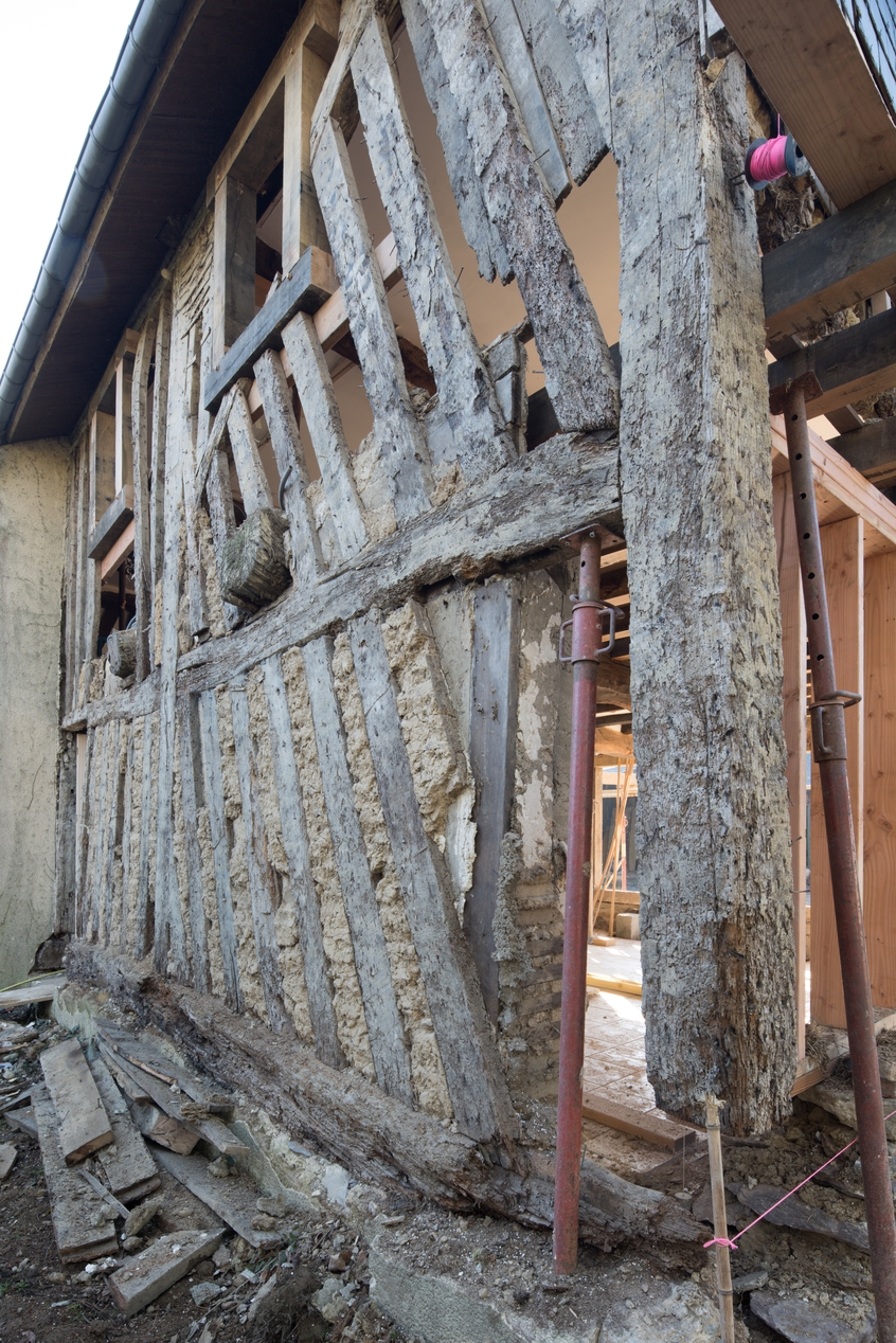 Pan de bois de la façade nord : sorties de poutre, colombes avec remplissage en torchis et traces de lattisImmatriculation