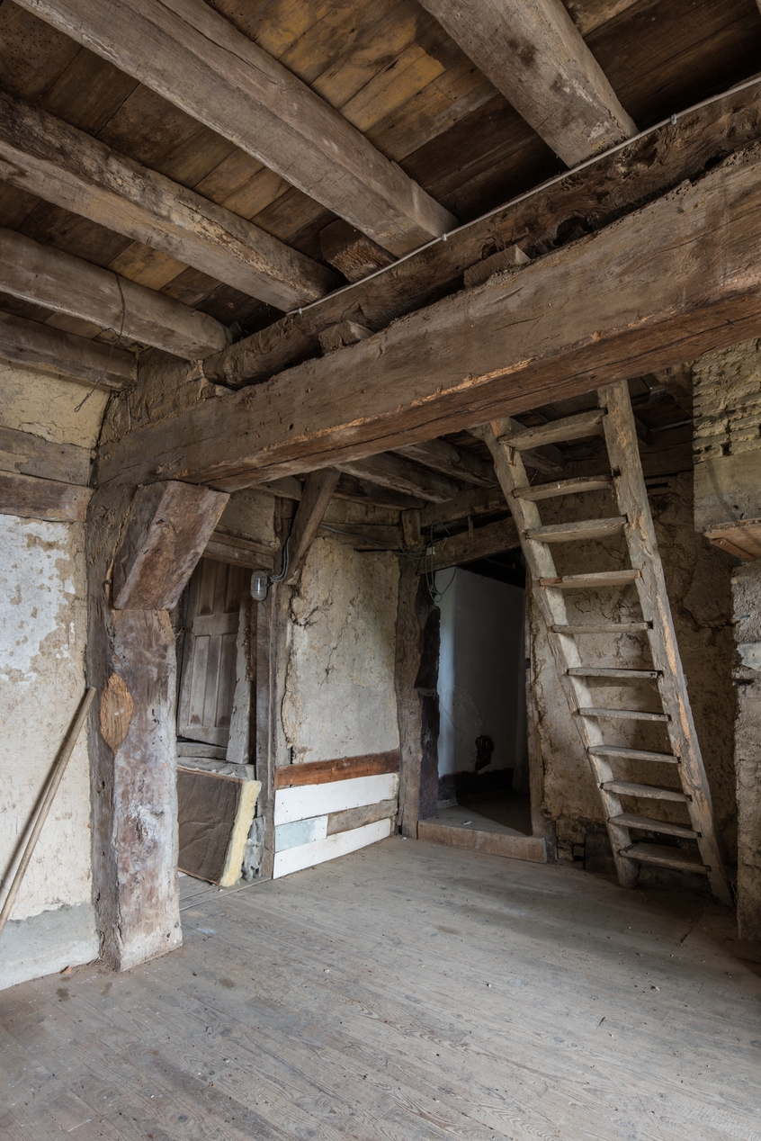 Intérieur du logis, étage, raccord d'une poutre du plafond avec un poteau de structure du pan de boisImmatriculation