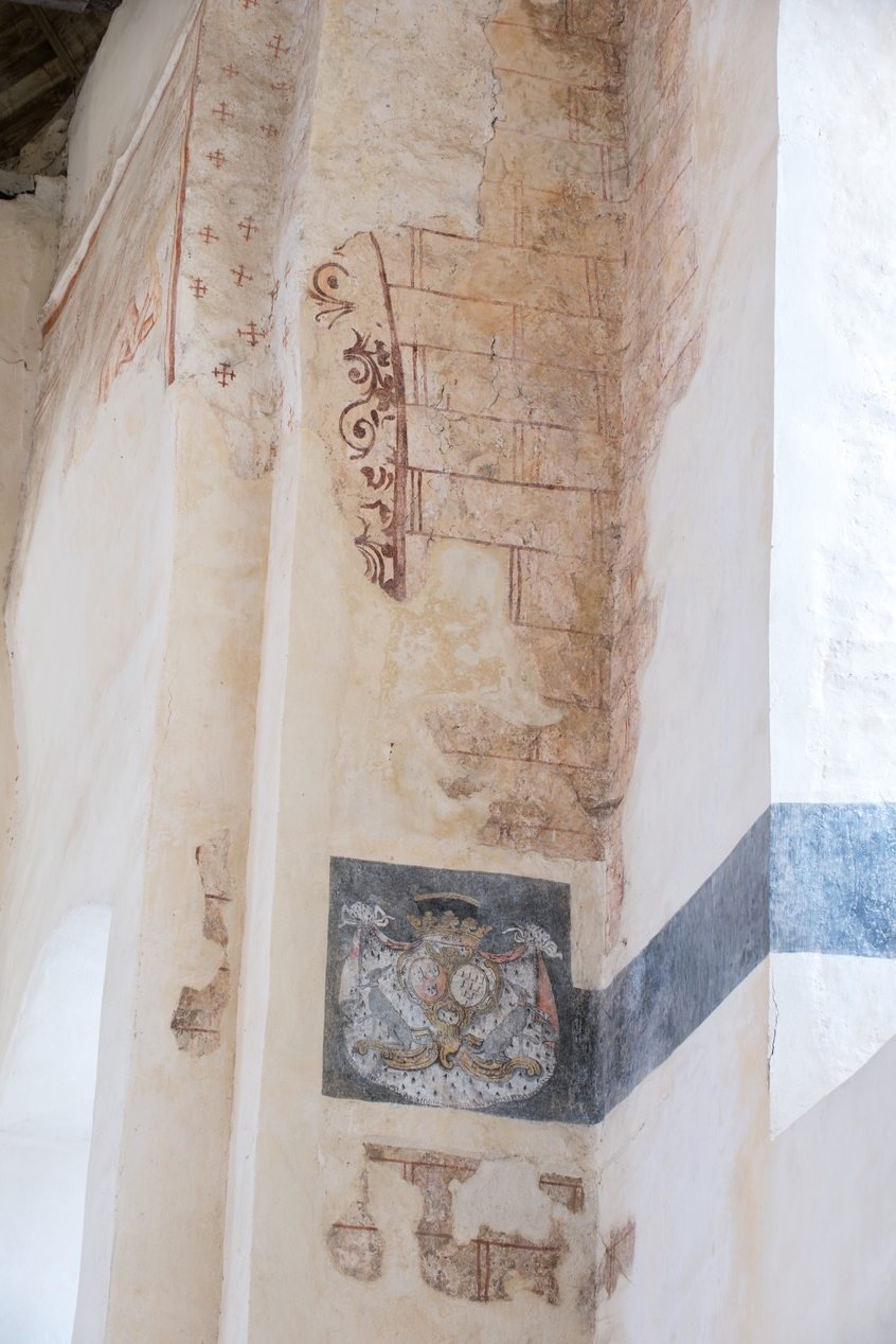 Peintures murales sur le mur sud du choeur. Blason scandant la litre funéraire.Immatriculation