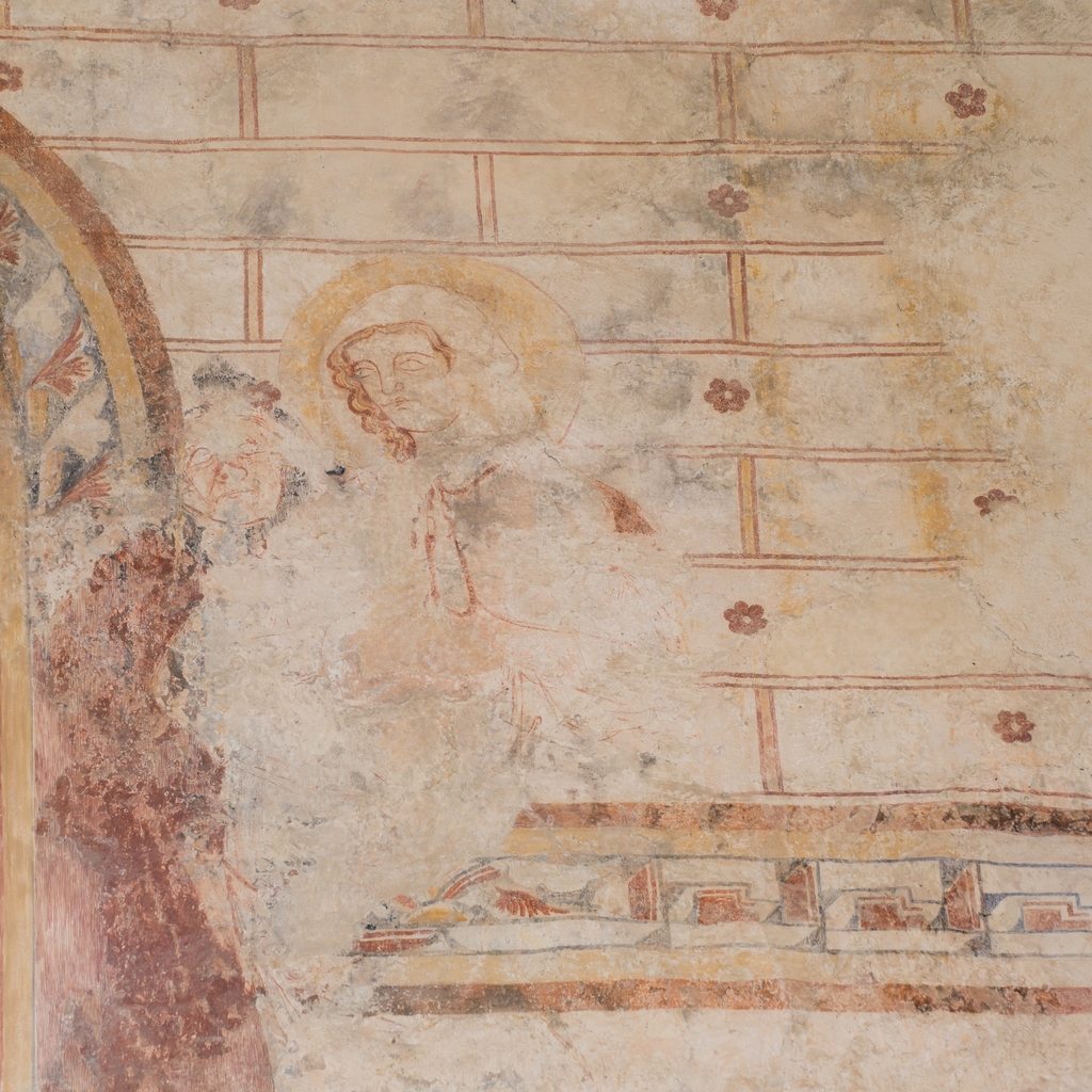 Mur nord du choeur, frise décorative du XIIIème siècle et vestige d'un décor figuré du XIVème siècle.Immatriculation