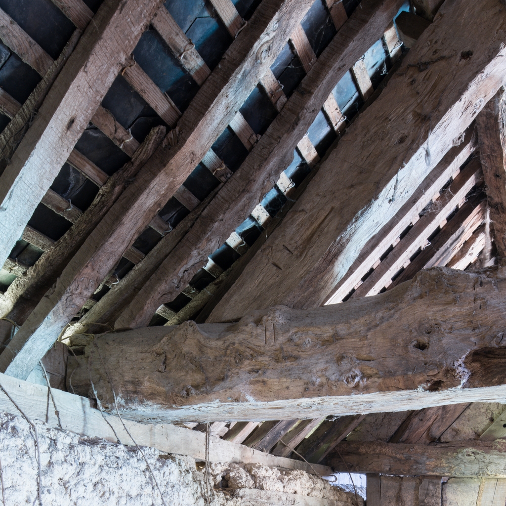 Détail d'une poutre de la charpente avec du bois de ragosseImmatriculation