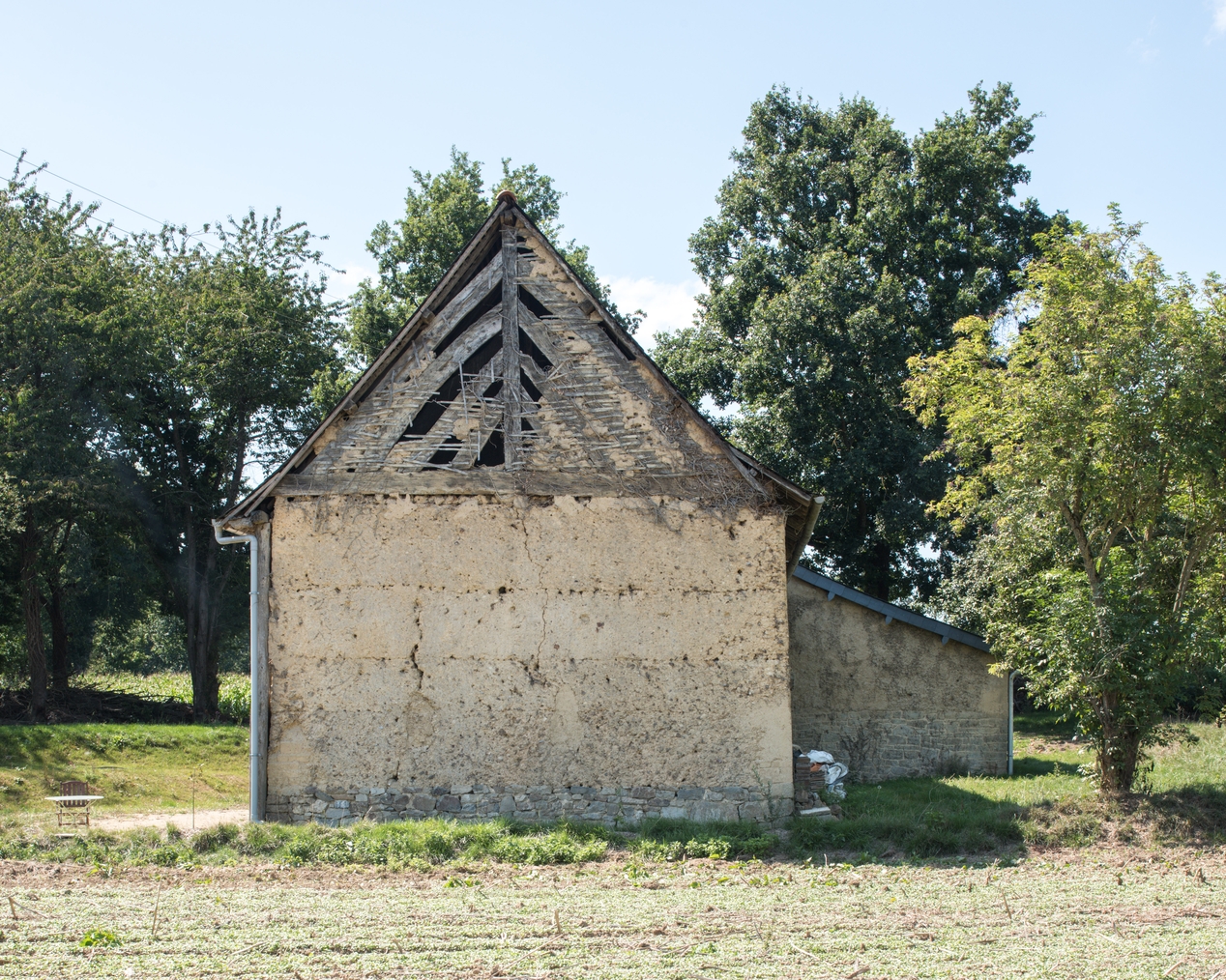 Vue du pignon en mottes de terre et tête de pignon en pan de boisImmatriculation