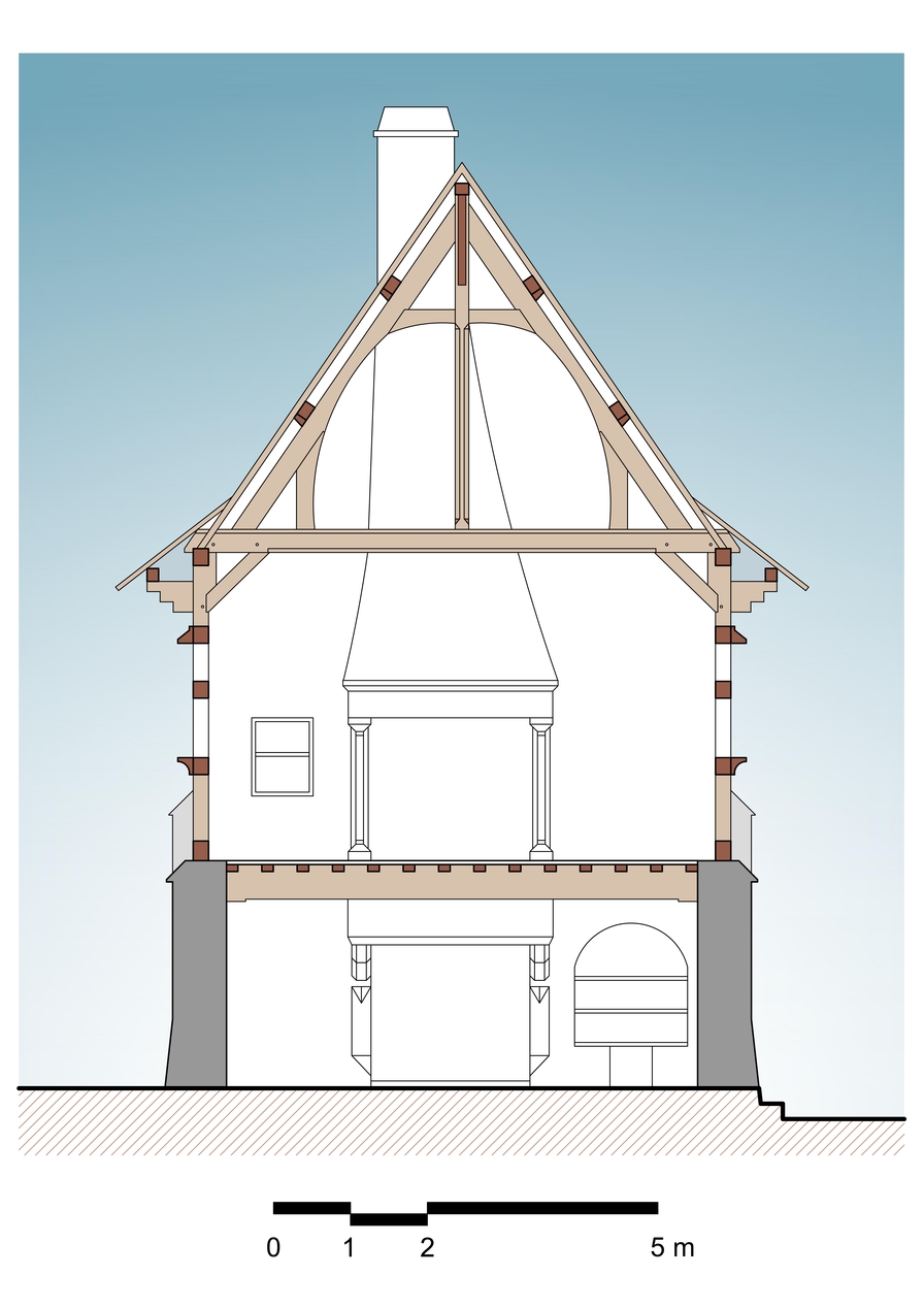 Coupe transversale restituant l'état supposé de la fin du 15e siècle avec salle haute sous charpente.Immatriculation