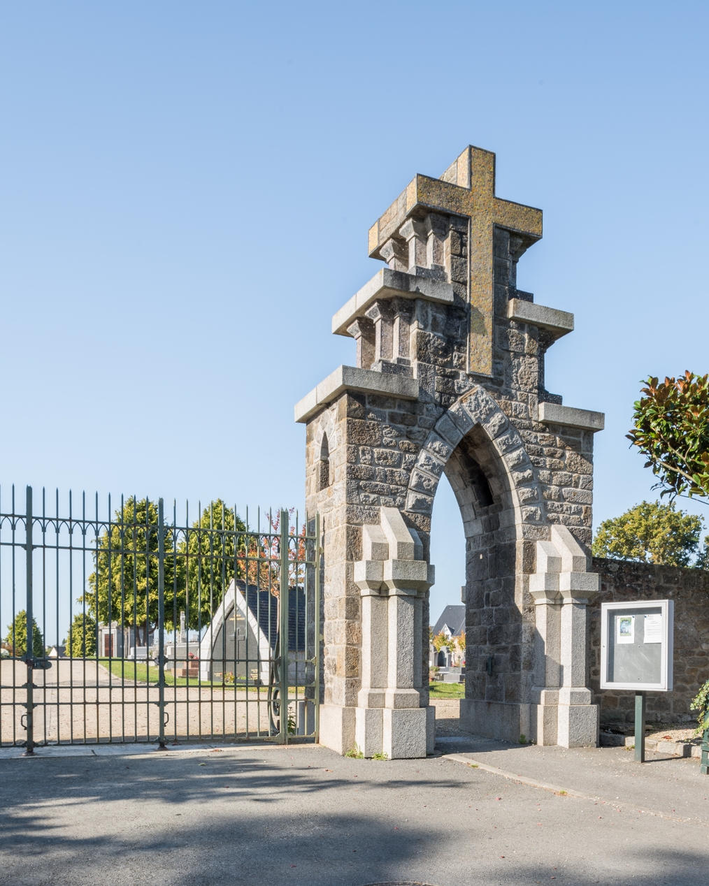 Détail de la porte piétonne en arc brisé, surmontée d'un pignon à redents et d'une croix de mosaïque OdoricoImmatriculation
