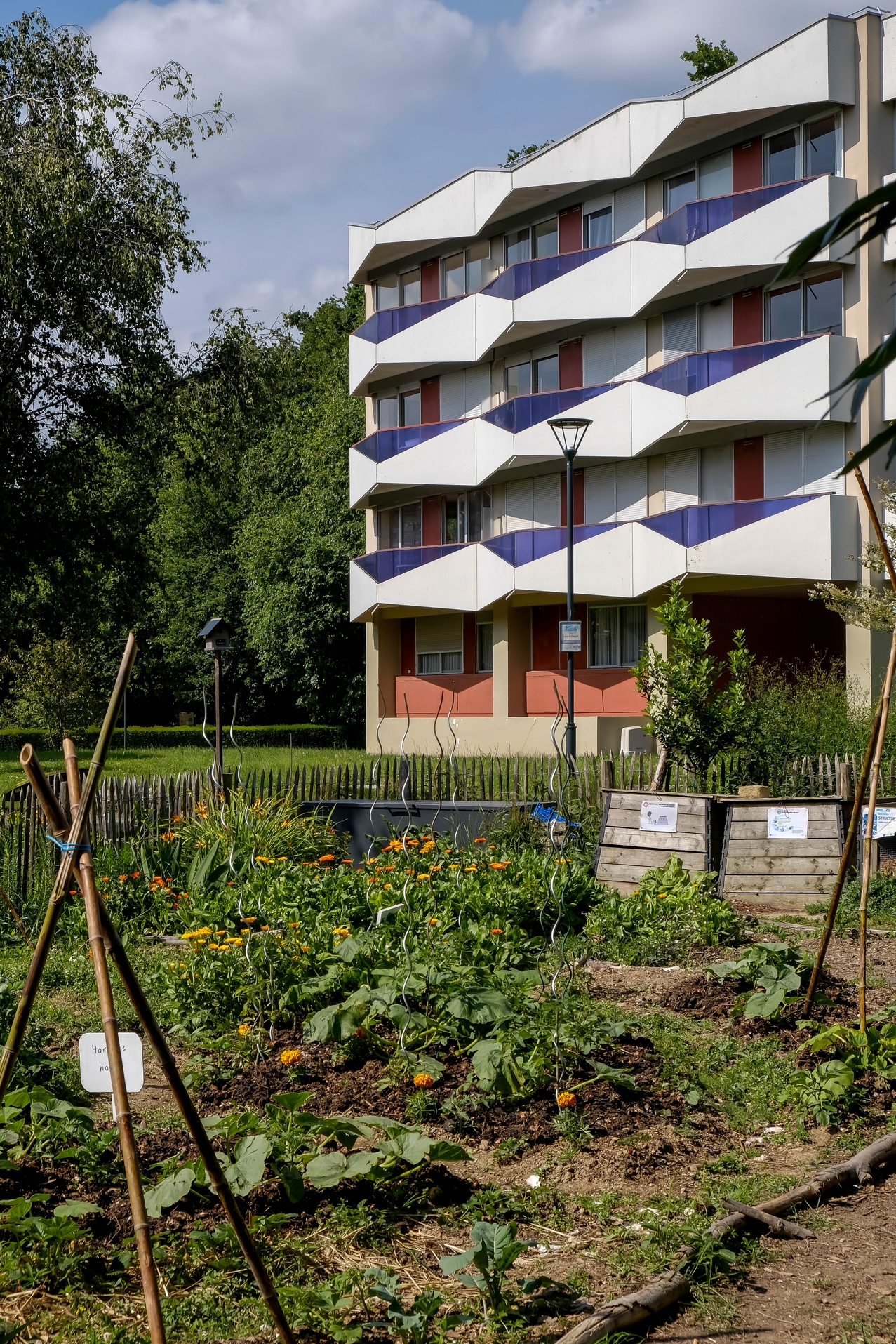 Vue de la façade de l'immeuble bas et du jardin d'agrément du square, 8 Square des Hautes OurmesImmatriculation