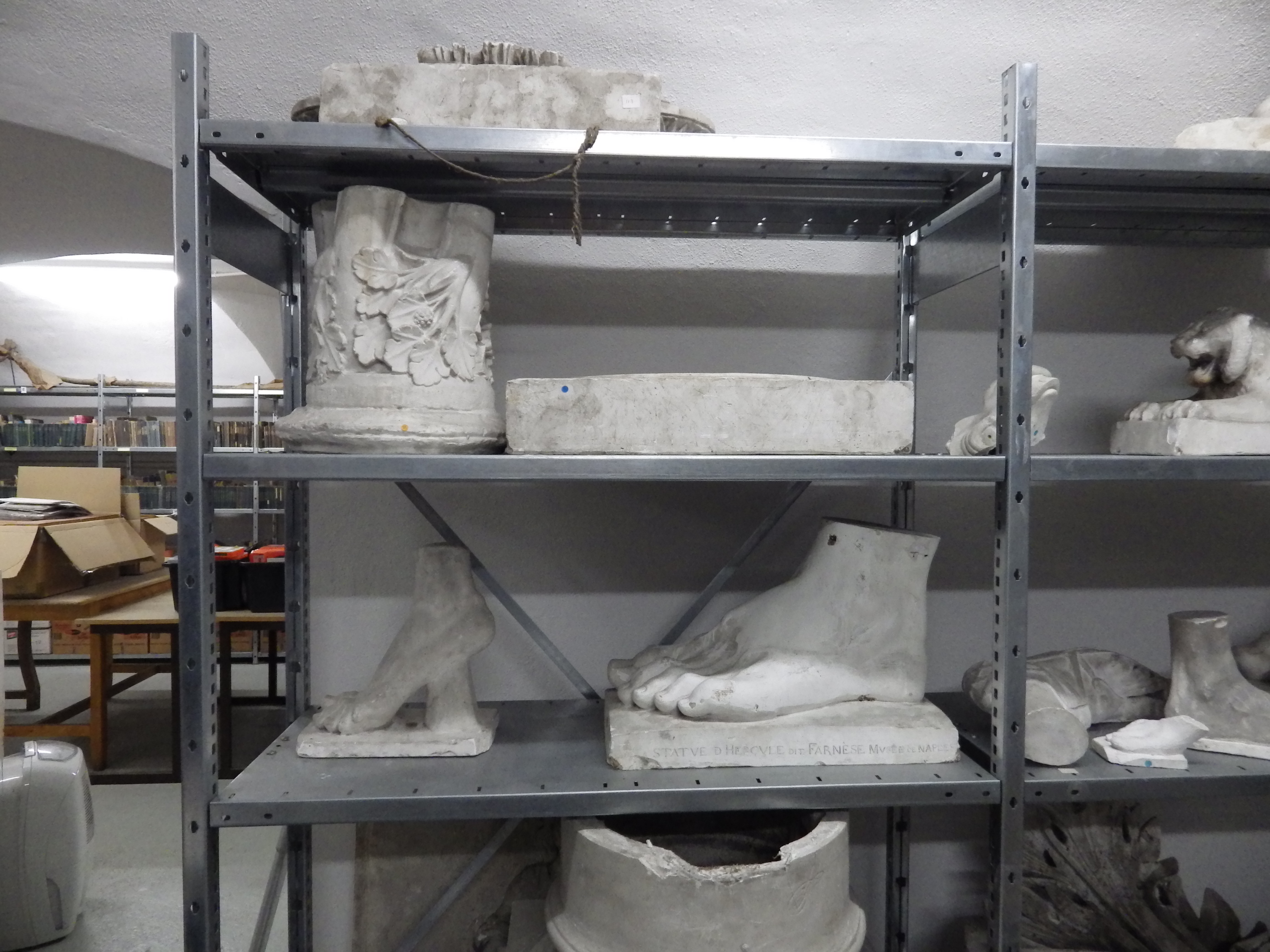 Collection des moulages en plâtre pour l'enseignement du dessin, conservée sur les étagères d'une caveImmatriculation