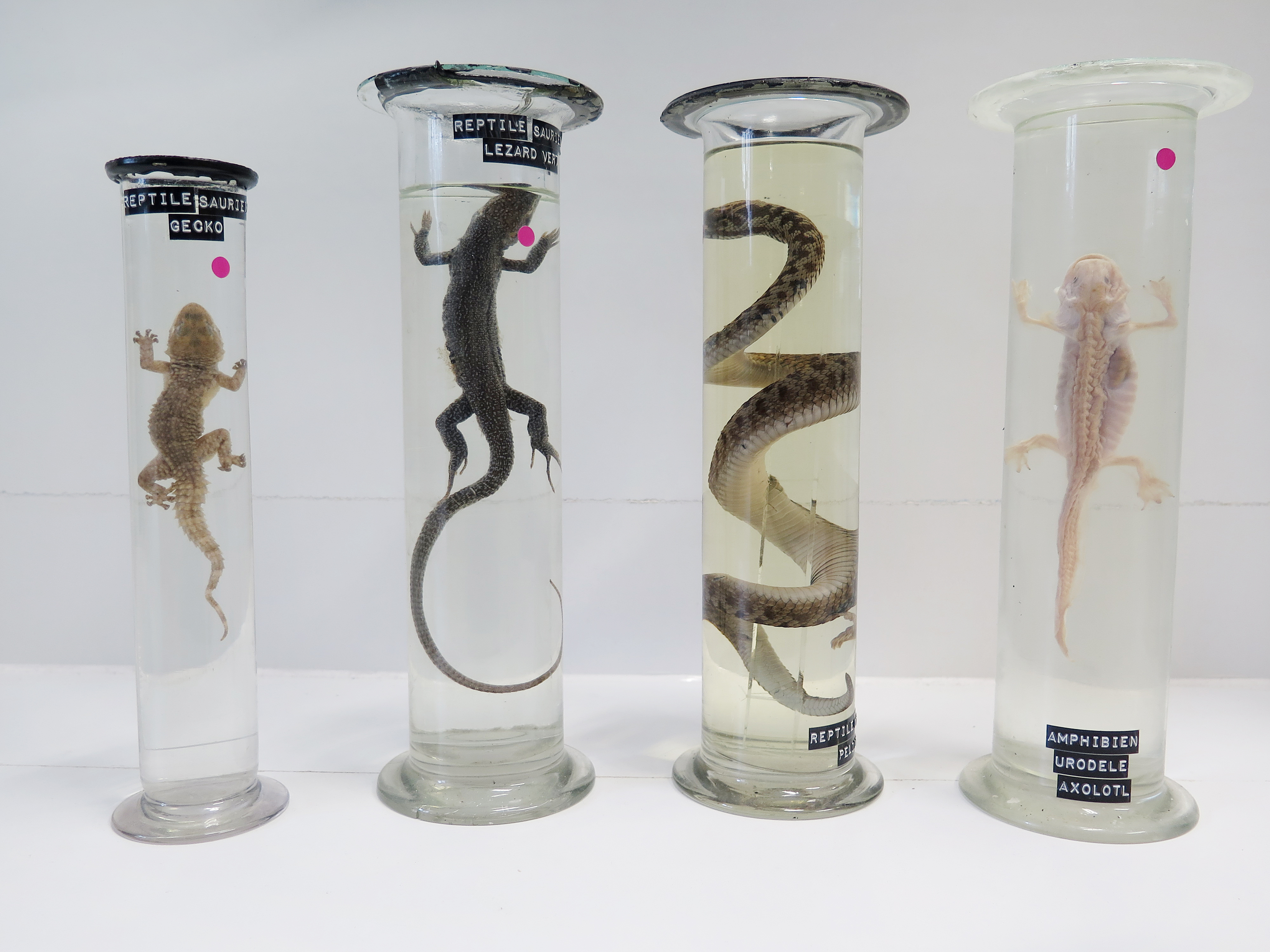 Ensemble de reptiles et amphibiens conservés dans des bocaux : gecko, lézard vert, vipère péliade, axolotl - Zoologie – Embranchement des vertébrés (Non signé)Immatriculation