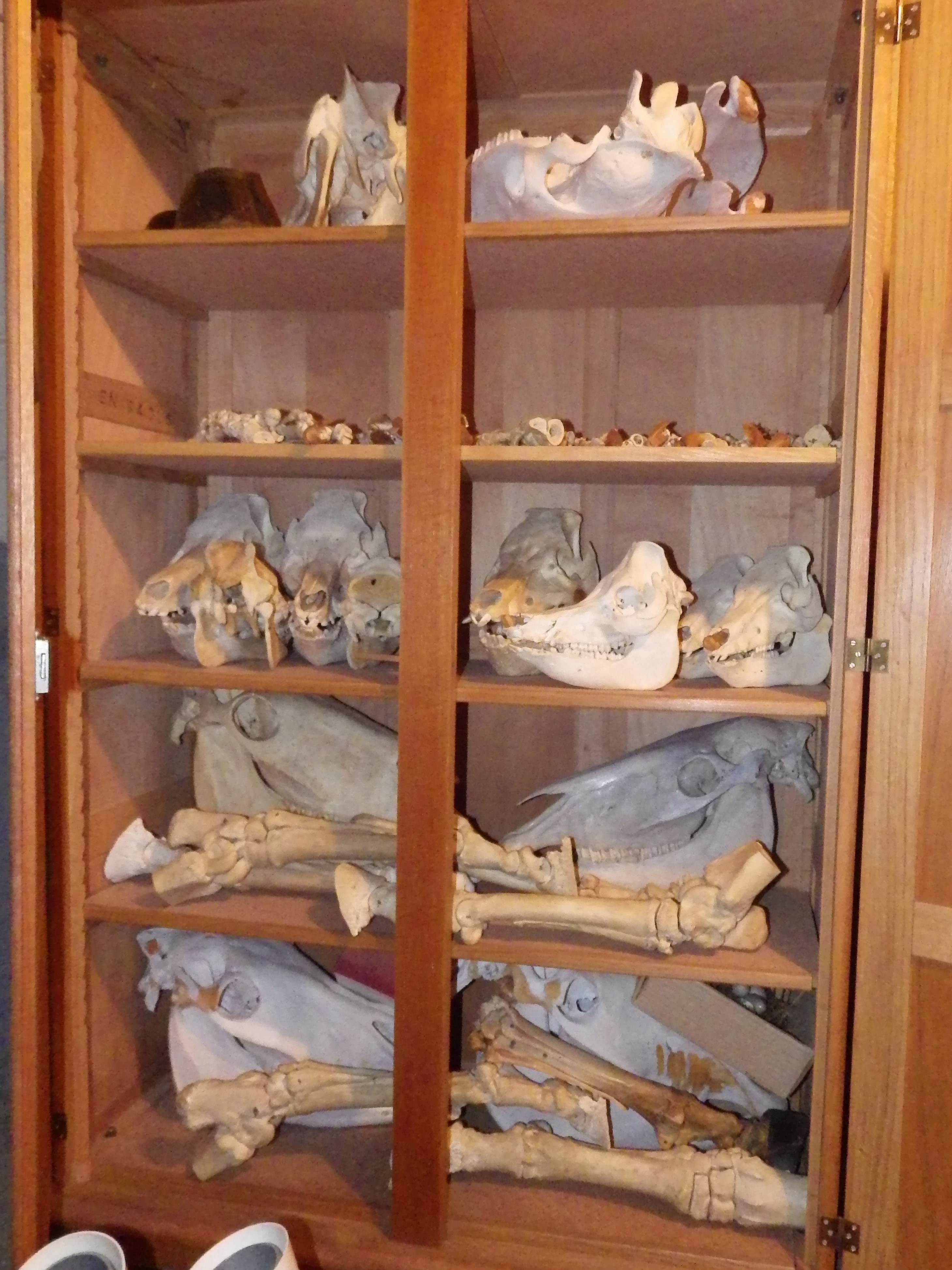 Une des armoires du sous-sol qui conservent des spécimens de zoologie – Embranchement des vertébrés (crânes et pattes)Immatriculation