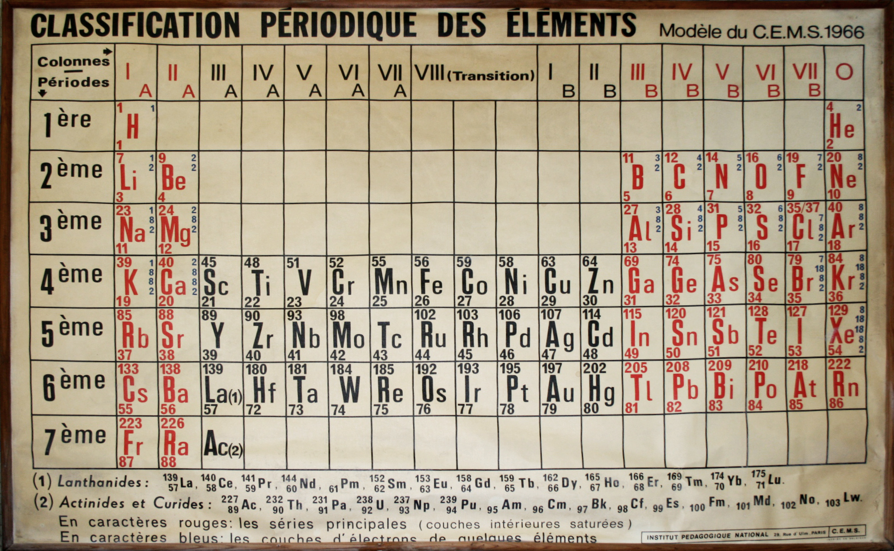 Tableau mural de classification périodique des éléments - Planche pédagogique (CEMS)Immatriculation