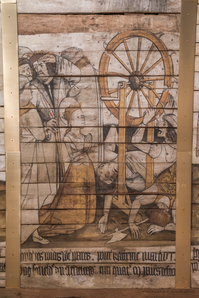 Lambris du XVème siècle. Cycle de sainte Catherine : la foudre détruit les roues qui devaient servir à son martyr. Mur nord, registre inférieurImmatriculation