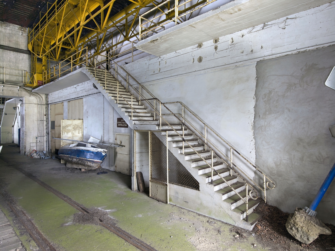 Vue du fond de l'alvéole sud : escalier donnant accès au premier étage. Peint en jaune, le pont roulant Levman est arrêté au-dessus de l'avancée du premier étageImmatriculation