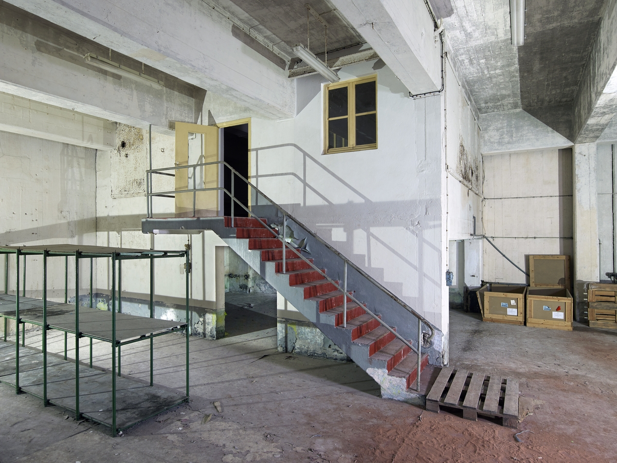 Vue d'un magasin situé au rez-de-chaussée de la base et bureau en mezzanine accessible par un escalier en béton armé avec garde-corps. Le magasin conserve des étagères tubulairesImmatriculation