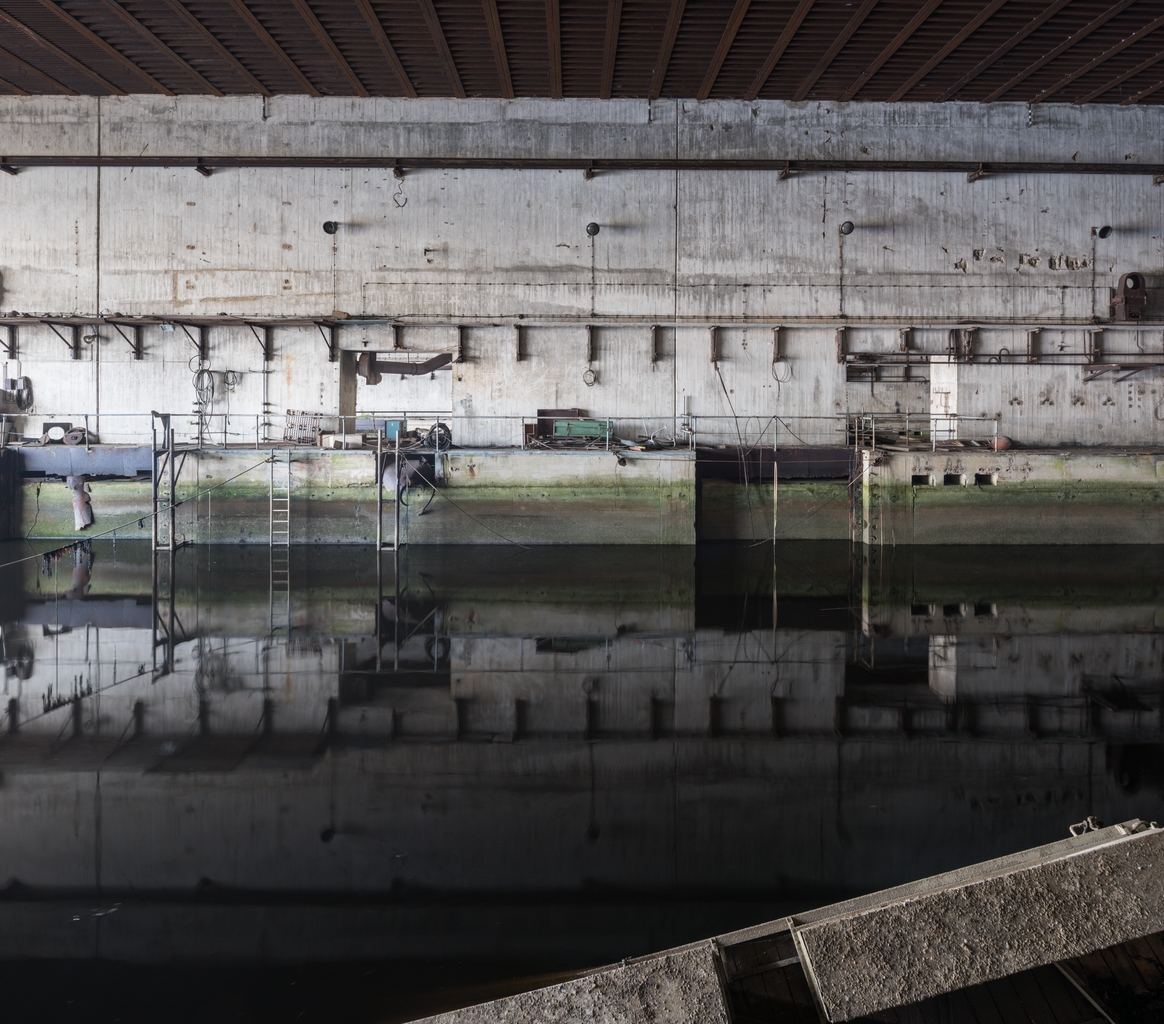 Vue de l'alvéole nord : emplacement de l'un des postes d’amarrage flottant du quai nord. Sur le mur, chemin de câble, lampes murales et système de chauffage et de ventilation. En haut, chemin de roulement du pontImmatriculation