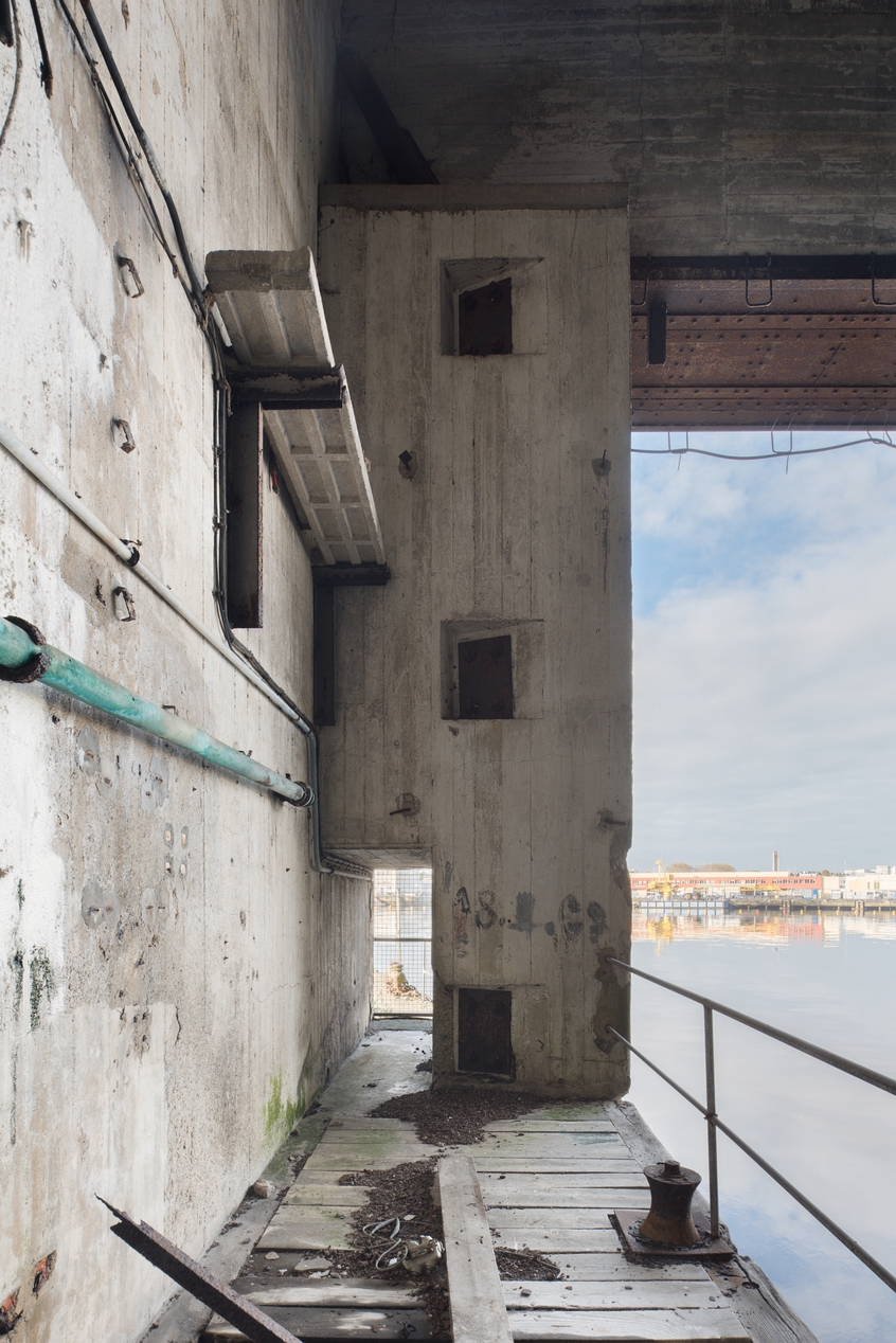 Vue du quai sud de l'alvéole sud. Au premier plan, platelage en bois du quai. A signaler : porte piétonne donnant vers l'ouest et triples fixations obliquesImmatriculation
