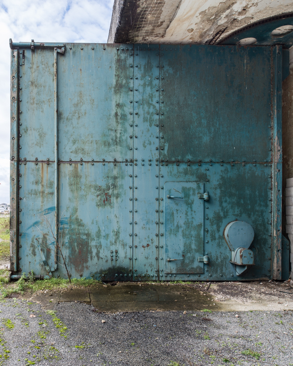 Vue de la porte blindée sud. La porte est dotée d'une petite avancée de protectionImmatriculation