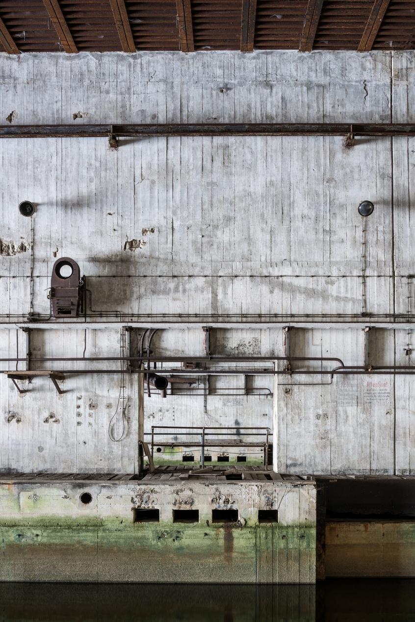 Vue de l'alvéole sud : emplacement de l'un des postes d’amarrage flottant. Sur le mur, système de chauffage et de ventilation et chemin de câbleImmatriculation