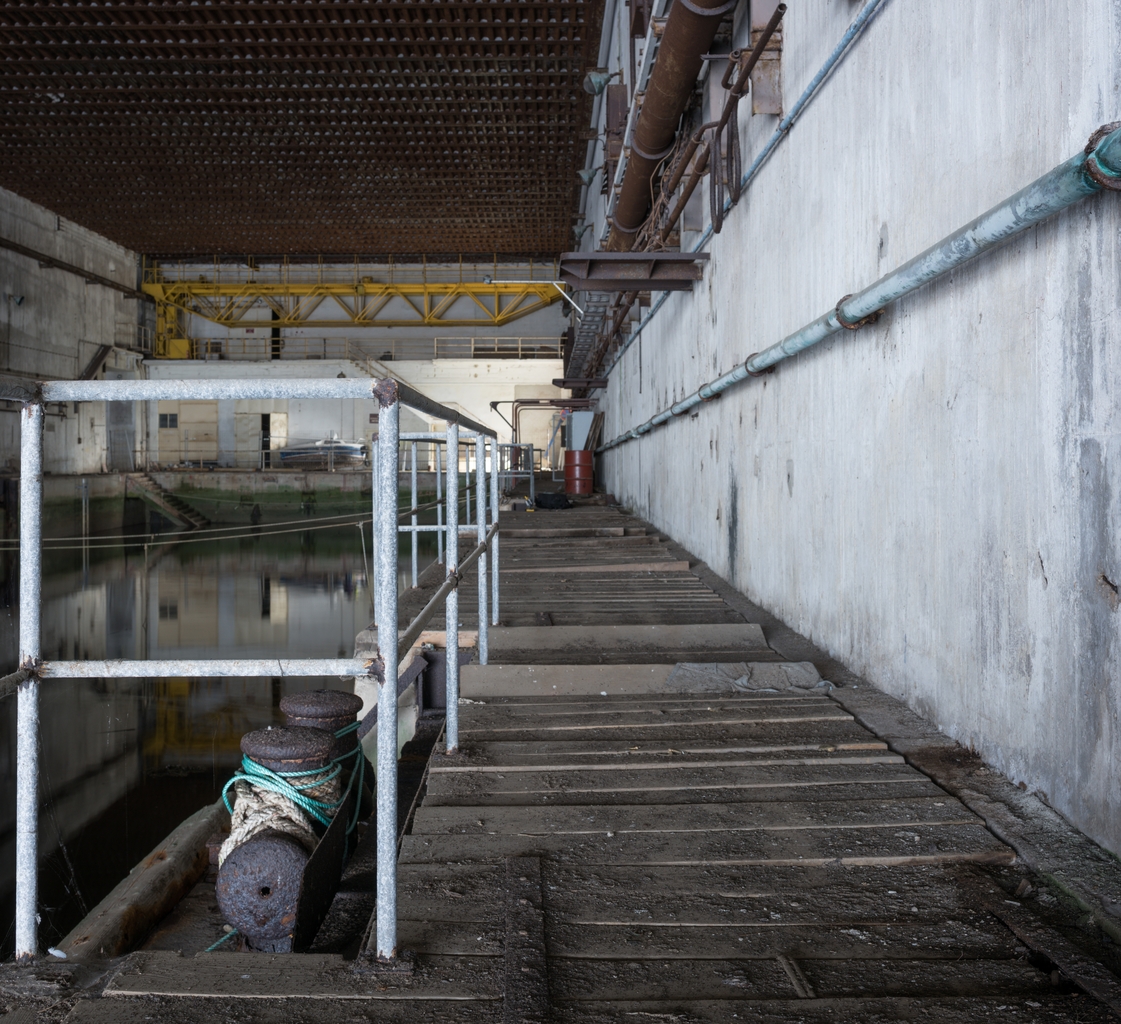 Vue du platelage en bois du quai sud de l'alvéole sud. A gauche, taquet de l'un des postes d'amarrage flottantImmatriculation