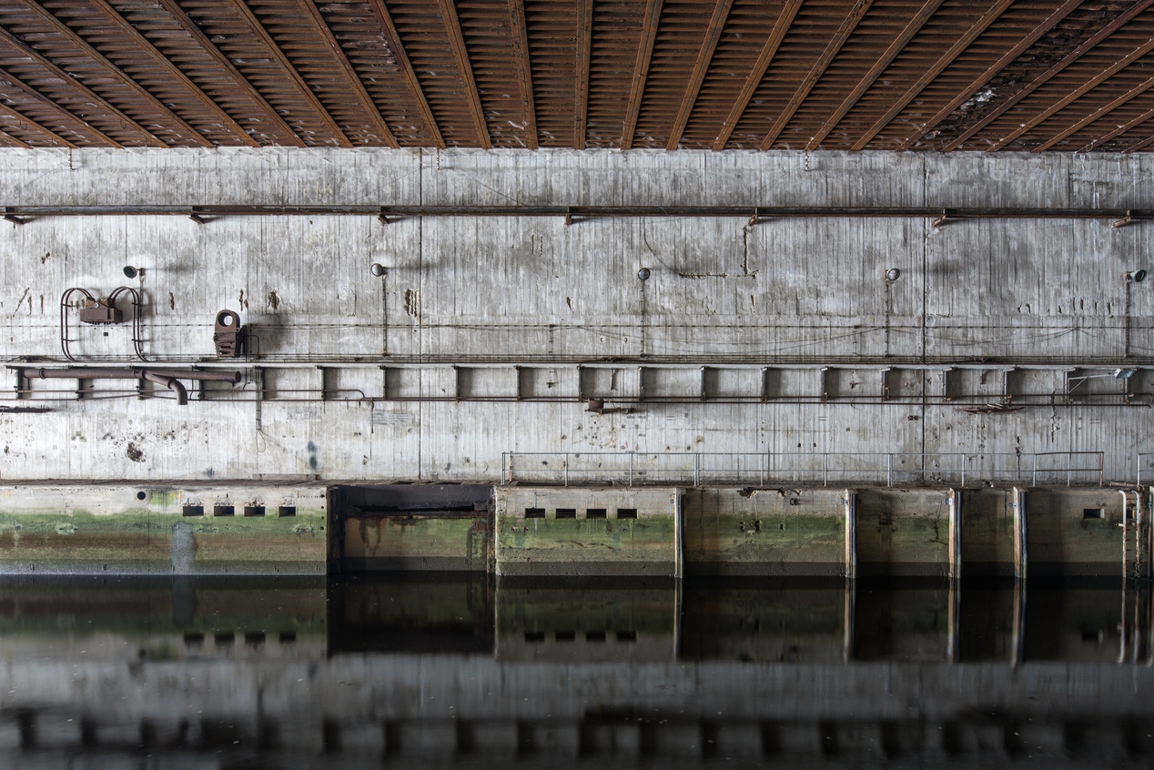 Vue du quai nord de l'alvéole nord : au niveau de l'eau, emplacement de l'un des postes d’amarrage flottant. Sur le mur, boîtier de connexion électrique avec voltmètre, système de chauffage et de ventilation, lampes murales et chemin de câble. En haut, chemin de roulement du pontImmatriculation