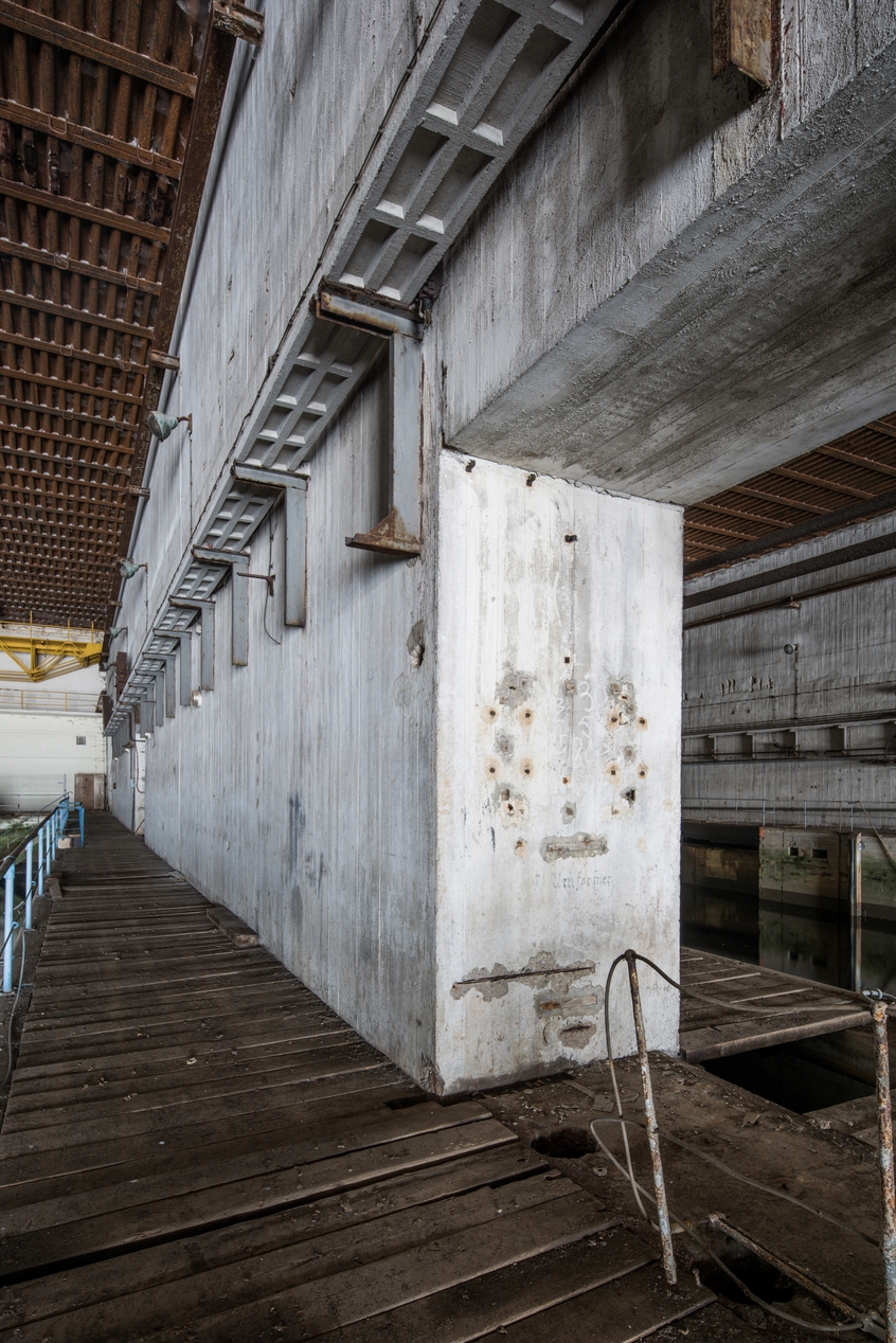Vue du mur de refend entre les deux alvéoles (1,5 m d'épaisseur). On aperçoit les traces de fixation du convertisseur et l'inscription en allemand Umformer. Fixés sur le mur, chemin de câble et système d'éclairage (lampe murale à globe)Immatriculation