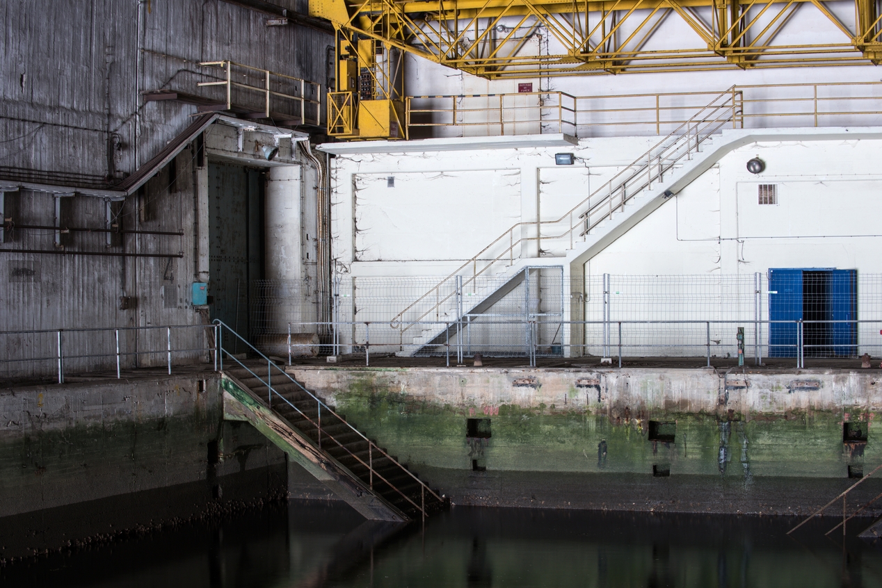 Vue du fond de l'alvéole nord : deux escaliers disposés en vis à vis permettent d'accéder au bassin. Peint en blanc, un troisième escalier donne accès au premier étage. En jaune, le pont roulant Levman arrêté au-dessus de l'avancée du premier étageImmatriculation