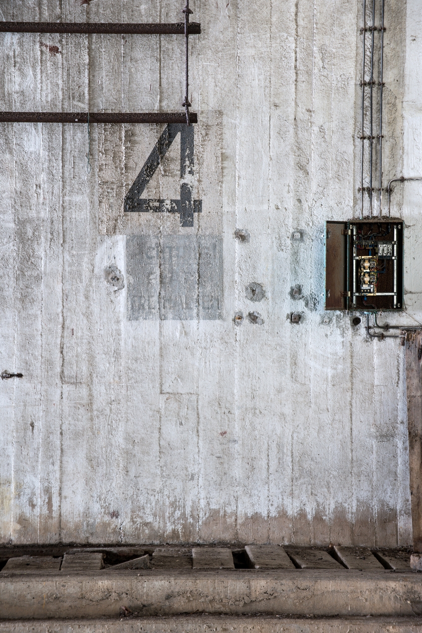 Vue du fond de l'alvéole nord : le numéro 4 peint en noir sur le mur correspond à la numérotation du quai d'amarrage. En-dessous, on peut lire l'inscription : ACHTUNG ! PLATZ FREHALTEN [Attention ! Lieu à garder libre]Immatriculation