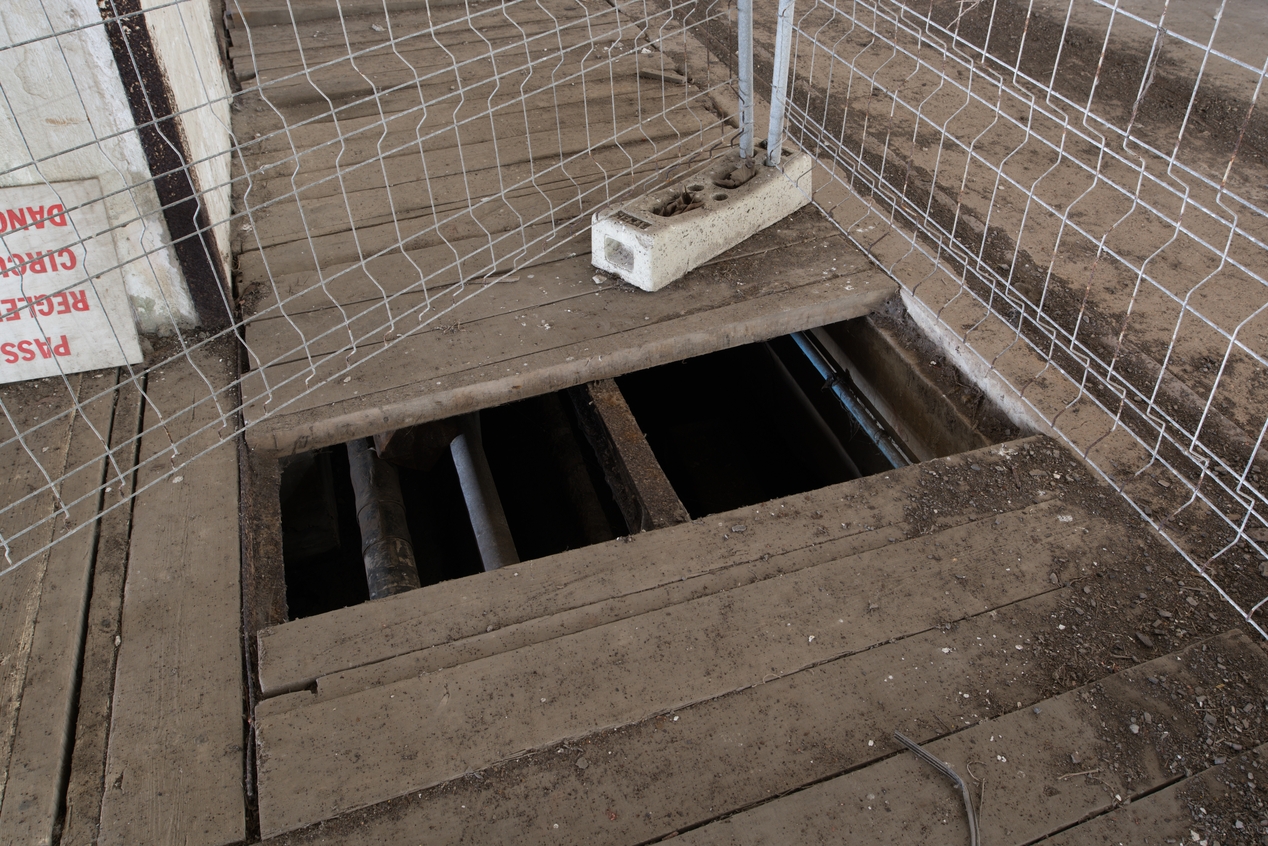 Vue des tuyaux qui passent sous le platelage en bois de la rue. Les fluides étaient destinés à avitailler les sous-marins à quaiImmatriculation