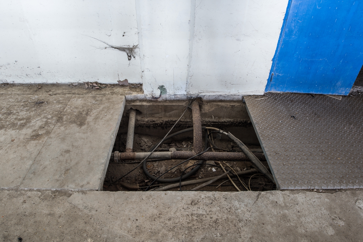 Vue des tuyaux qui passent le long de la rue. Les fluides étaient destinés à avitailler les sous-marins à quaiImmatriculation