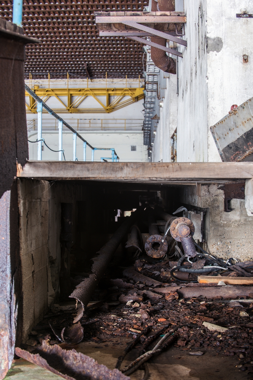 Vue des tuyaux passant sous le platelage en bois du quai central de l'alvéole nord. Les fluides étaient destinés à avitailler les sous-marins à quaiImmatriculation