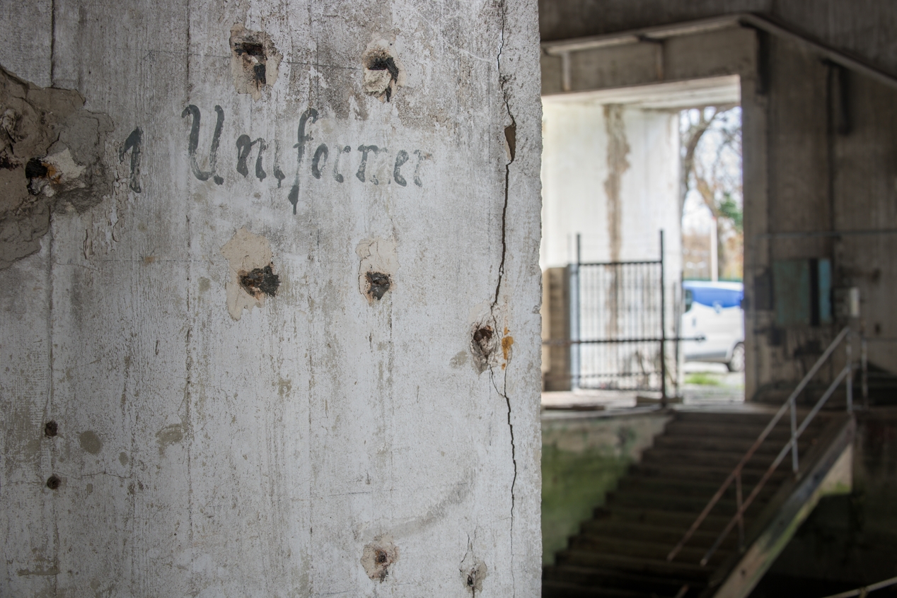 Vue d'une inscription en allemand sur le mur de refend des deux alvéoles signalant l'emplacement du convertisseur : 1 Umformer. On aperçoit des traces de fixation sur le murImmatriculation